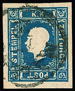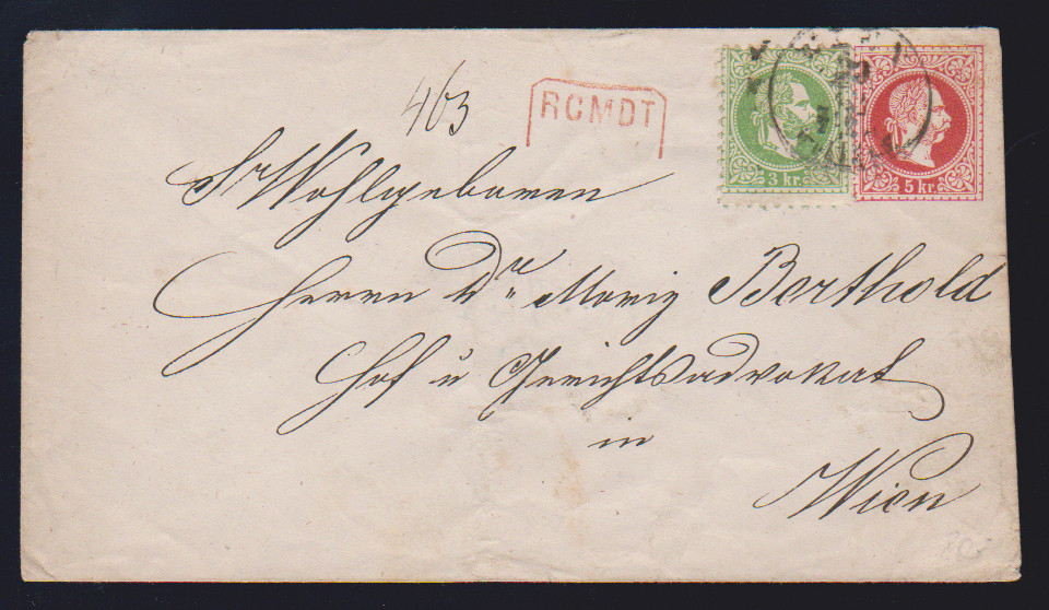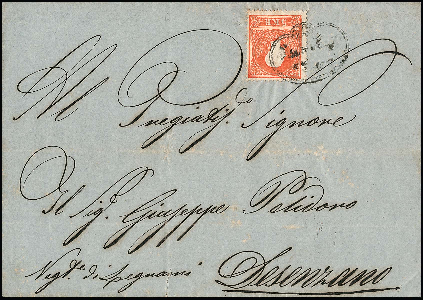 5 Kr. rot, Type I, Kabinettstück auf Brief (dieser Falten, teils etwas getönt, ausserhalb) mit sehr seltener Entwertung durch Zier-Ovalstempel "Imp. Reg. Vapori"