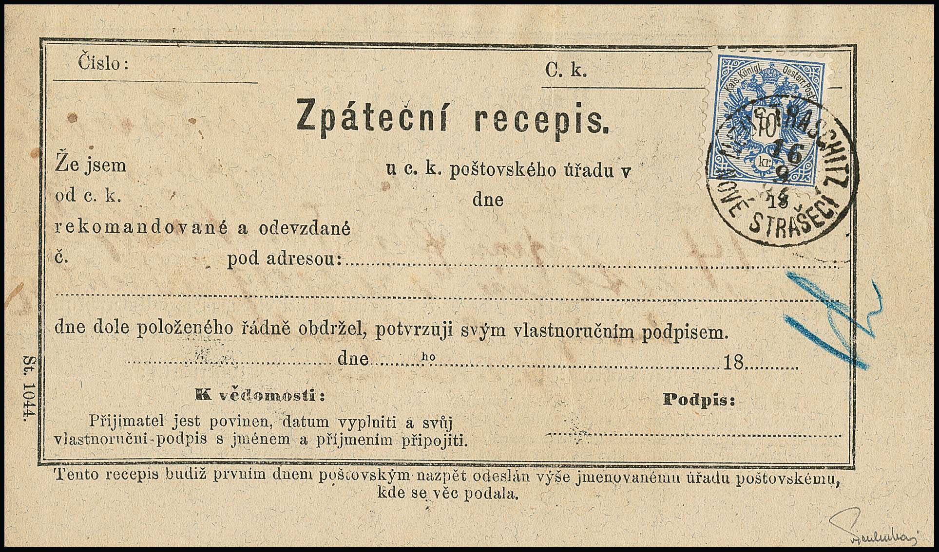 10 Kr. schw./blau einzeln auf tschechischer Retour-Recepisse mit K1 "Neu-Straschitz" 1884, sign. mit Fotoexp. Ferchenbauer