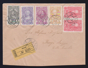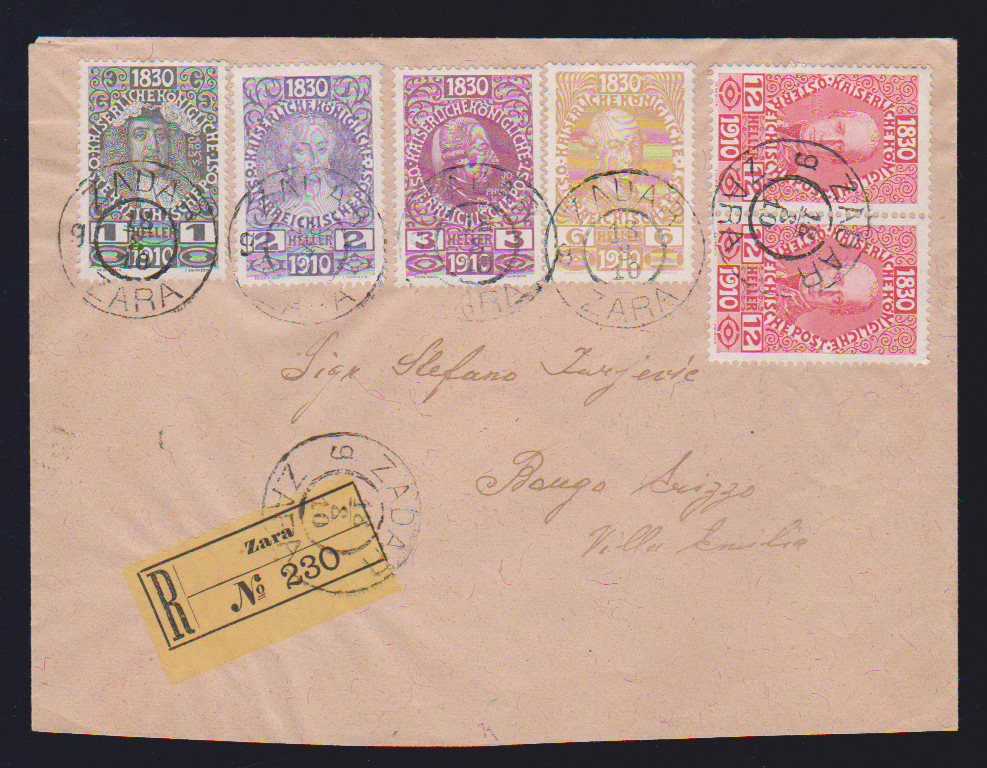 1, 2, 3, 6 und Paar 12 Ö. Kaisergeburtstag auf R-FDC aus Zara, 18.8.1910