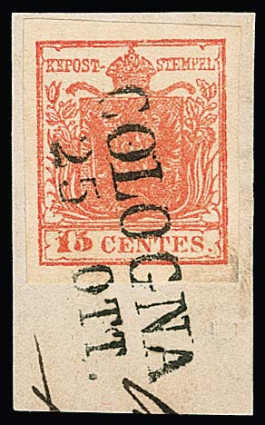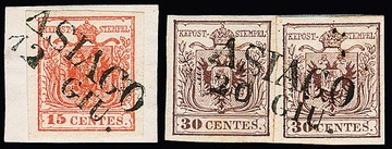 "Ceneda", L2 auf Luxusbriefstück 30 C. und auf loser 15 C., dazu der gestrichelte Einkreisstempel auf Luxusbriefstück 15 C., auf Brief 15 C. (oben ber.), sowie auf drei losen Werten