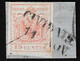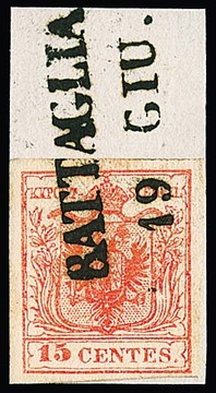 "Battaglia", L2 auf vier losen Werten, einem Luxusbriefstück 15 C. rot, sowie auf Brief 5 So. rot