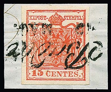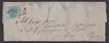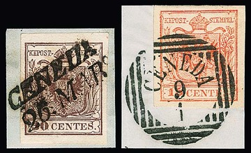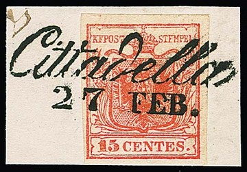 "Cittadella", Schreibschrift-L2 ideal auf Luxusbriefstück 15 C., ferner auf zwei losen Werten, sowie auf zwei Prachtbriefen 15 C.
