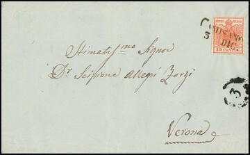 "Camisano", L2 auf Kabinettbrief 15 C. nach Verona, sowie K1 auf Brief 5 So. und zwei losen Marken