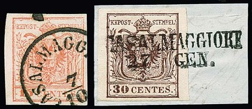 "Asiago", L2 voll auf zwei Luxusbriefstücken 15 C. rosa bzw. zweimal 30 C. braun, sowie auf loser 30 C.