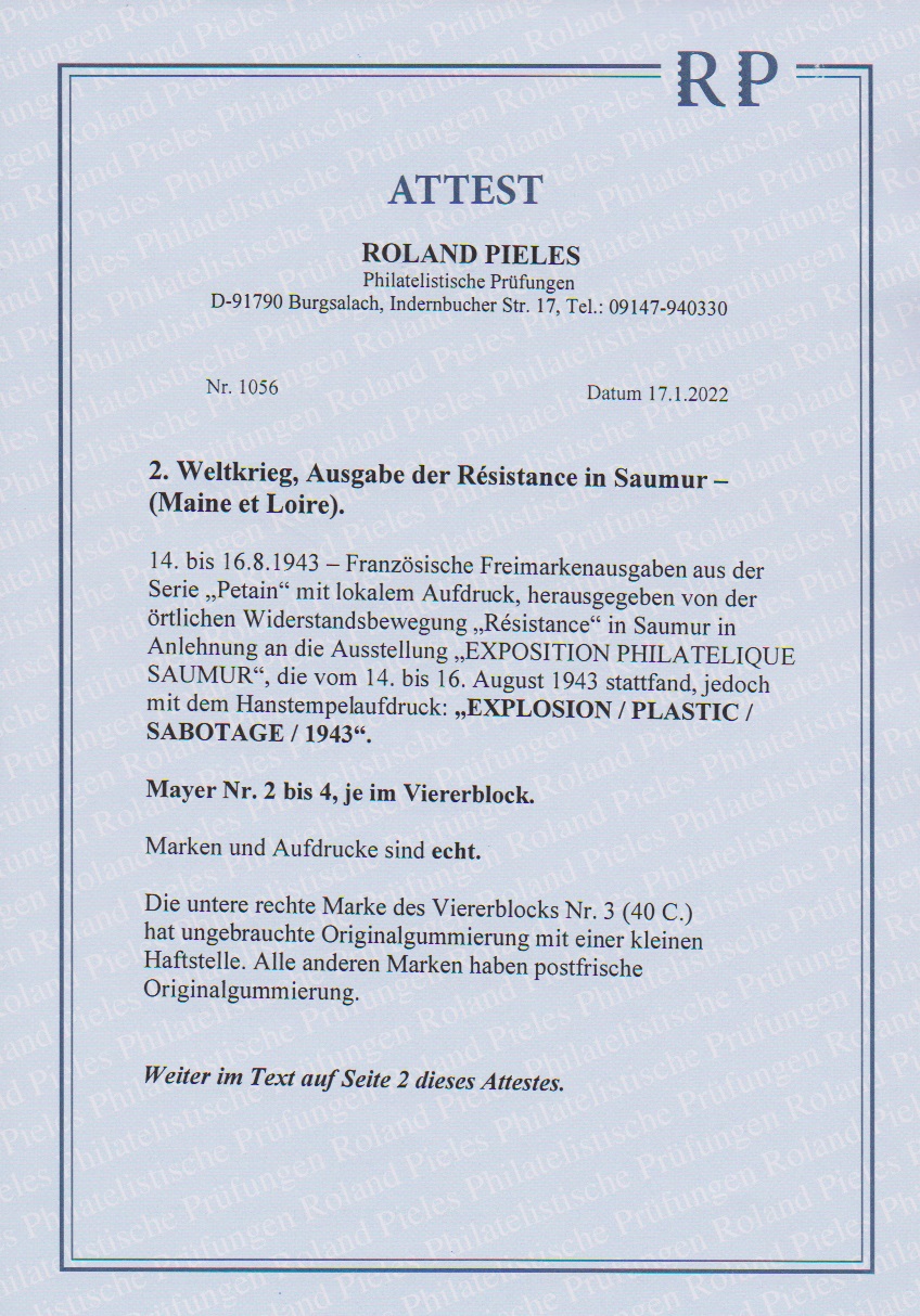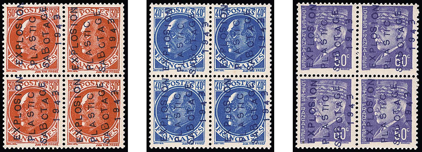 Saumur (Maine et Loire), Ausgabe der Résistance, 14./16.8.1943, drei Werte Petain je mit lokalem Aufdruck der Résistance "Explosion Plastic Sabotage 1943". Eine Marke Nr. 3 ungebraucht, sonst postfrisch, drei kleine Pünktchen sind für diese sehr seltene Résistance-Ausgabe nicht untypisch. Attest Pieles (2022)
