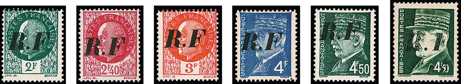 Vire (Calvados), 1944, Sonderausgabe "Persönlichkeiten", komplette ungebrauchte Serie aller sechs verschiedener Werte mit lokalem Aufdruck. Selten, Attest Pieles (2021)