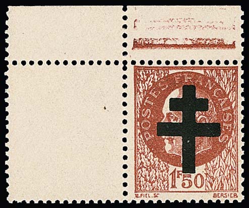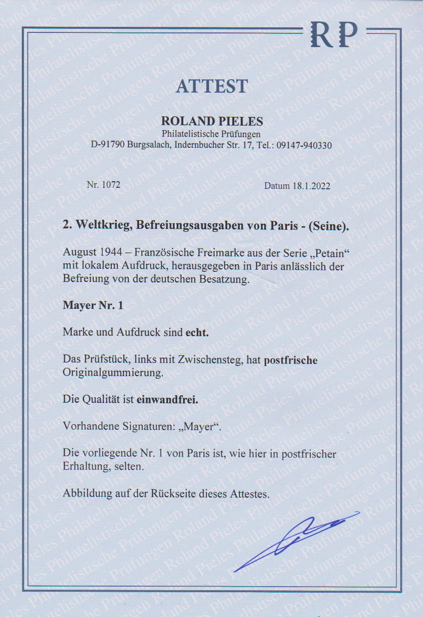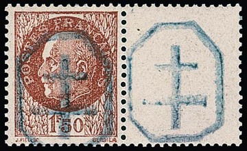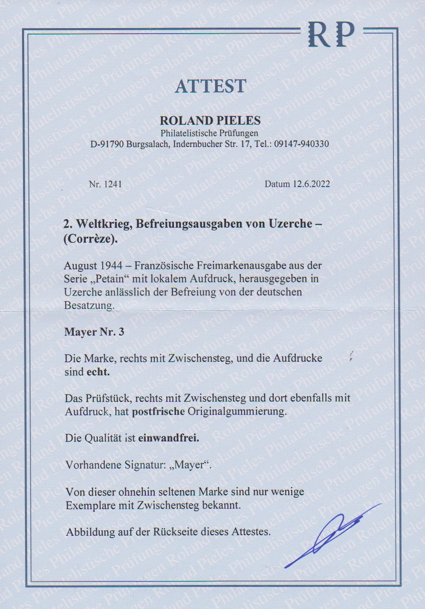 Uzerche, 1944, 1,50 Fr. Petain mit lokalem Lothringerkreuz-Aufdruck, anläßlich der Befreiung, tadellos postfrisch, rechts mit Zwischensteg, dieser ebenfalls mit Aufdruck. Sign. Mayer und Attest Pieles: "Von dieser ohnehin seltenen Marke sind nur wenige Exemplare mit Zwischensteg bekannt."