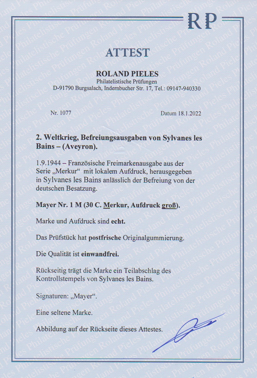 Sylvanes les Bains (Aveyron), 1.9.1944, 30 C. in der Type mit großem Aufdruck tadellos postfrisch, eine seltene Marke. Sign. Mayer und Attest Pieles (2022)