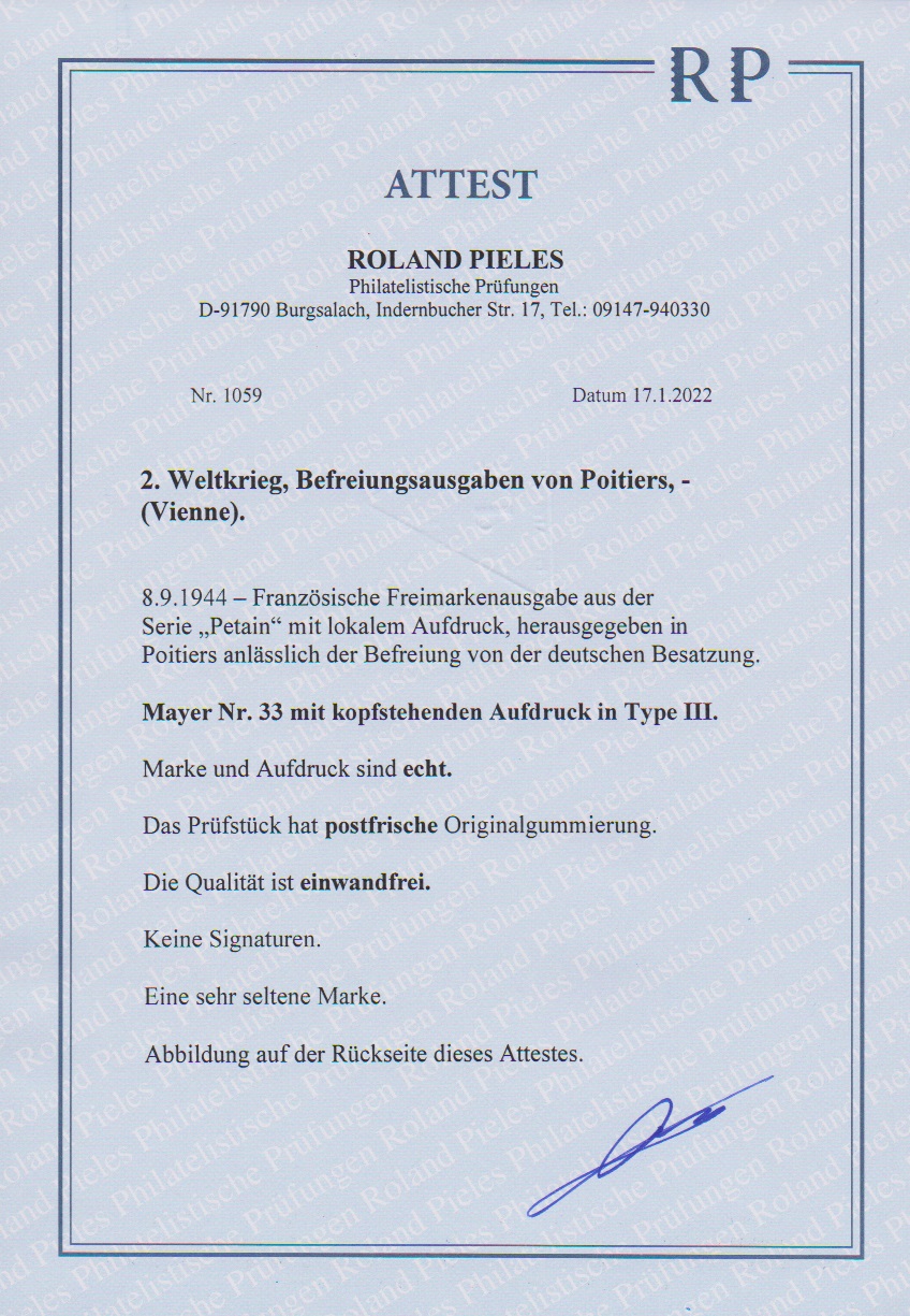 Poitiers (Vienne), 8.9. 1944, der seltene Höchstwert 50 Fr. Petain mit lokalem Aufdruck in Type III kopfstehend tadellos postfrisch. Als "Kopfsteher" keine handvoll Exemplare bekannt und eine der großen Raritäten dieses Gebietes! Attest Pieles (2022)