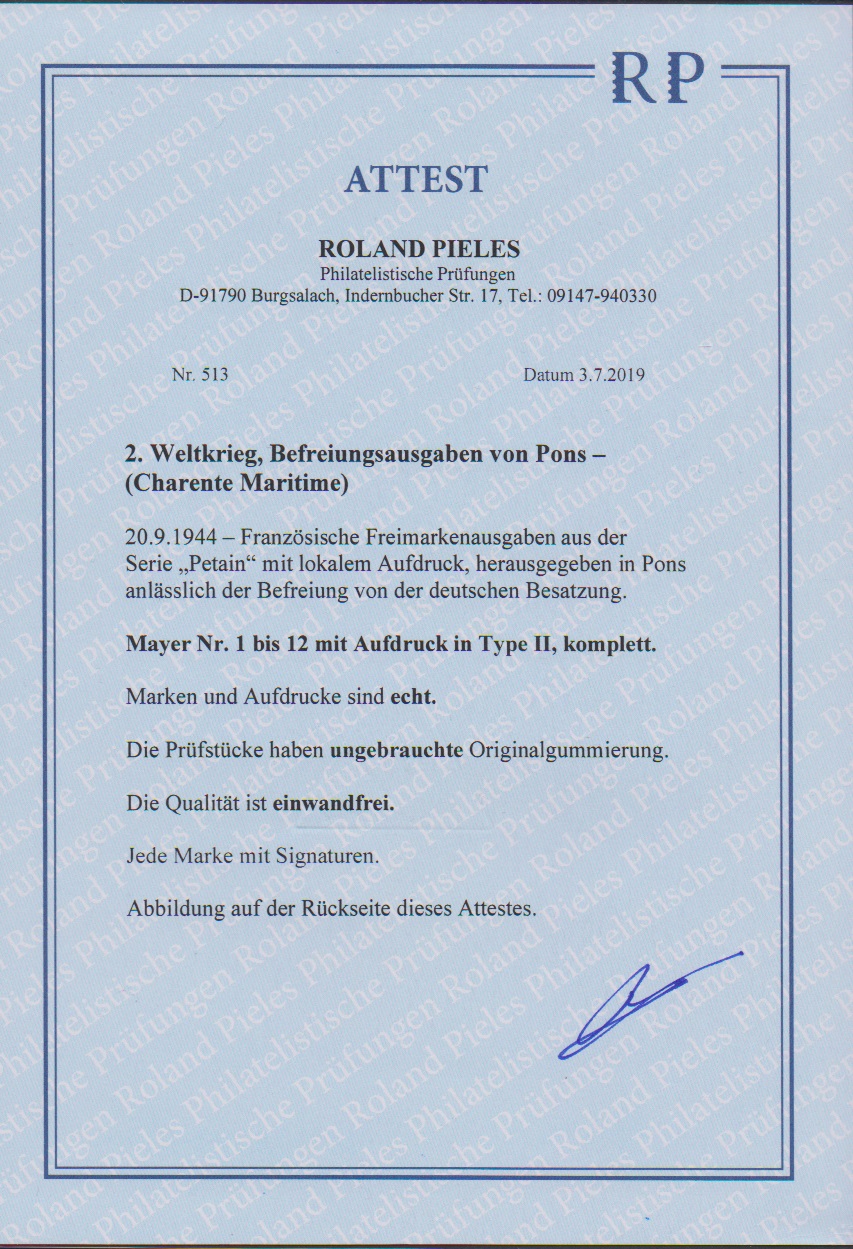 Pons (Charente Maritime), 20.9.1944, komplette Serie "Petain" mit lokalem Aufdruck in Type II tadellos ungebraucht, seltene Serie, Attest Pieles (2019)