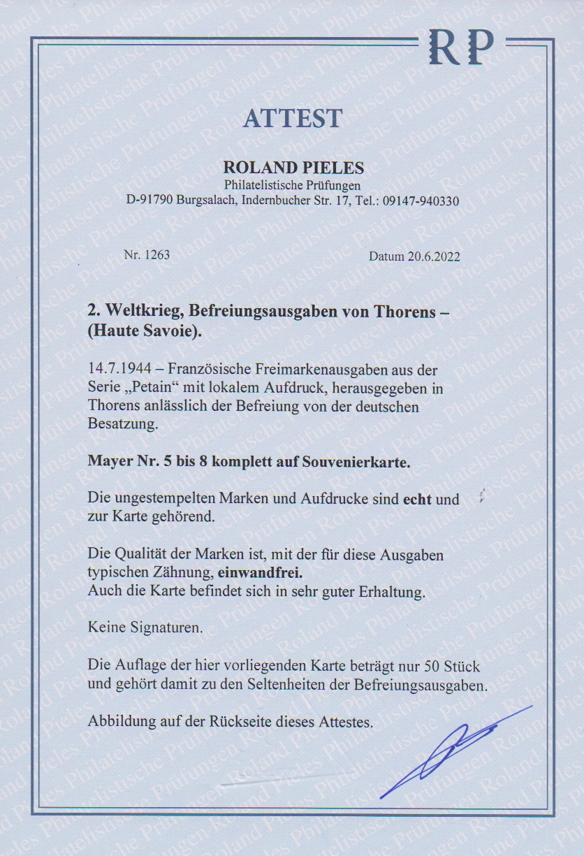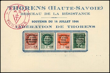 Thorens, 1944, vollständige Serie aller vier Petain-Werte mit unterschiedlichen lokalen Aufdrucken, anläßlich der Befreiung, auf Souvenirkarte, im Michel erwähnt, aber ohne Bewertung, Mayer Nr. 5-8 (3000,-). Attest Pieles: "... einwandfrei ... Die Auflage der hier vorliegenden Karte beträgt nur 50 Stück und gehört damit zu den Seltenheiten der Befreiungsausgaben."