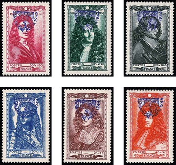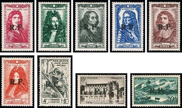 Salon de Provence, 1944, Freimarken "Persönlichkeiten des 17. Jahrhunderts, Schloß und Landschaften", komplette postfrische Serie aller neun Werte je mit lokalem Aufdruck "R.F.", anläßlich der Befreiung von der deutschen Besatzung. Mayer "Commémoratifs" (7776,- Euro), sign. Calves und Attest Pieles: "Die Auflage dieser Marken beträgt nur je 80 Stück. Damit gehören diese Marken zu den Seltenheiten der Befreiungsausgaben."