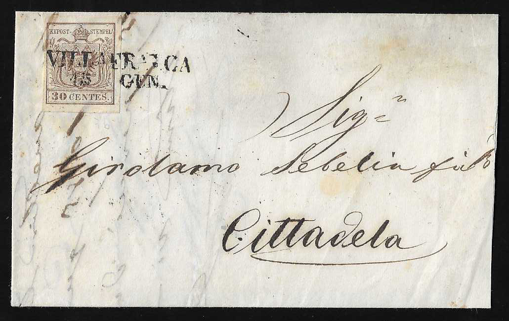 "Villafranca", guter L2 auf Faltbrief mit Prachtstück 30 C. braun, ferner der Dreiringstempel auf drei Briefen 15 C., 30 C. (sign. Sorani) sowie 5 So. Dazu zwei lose Marken