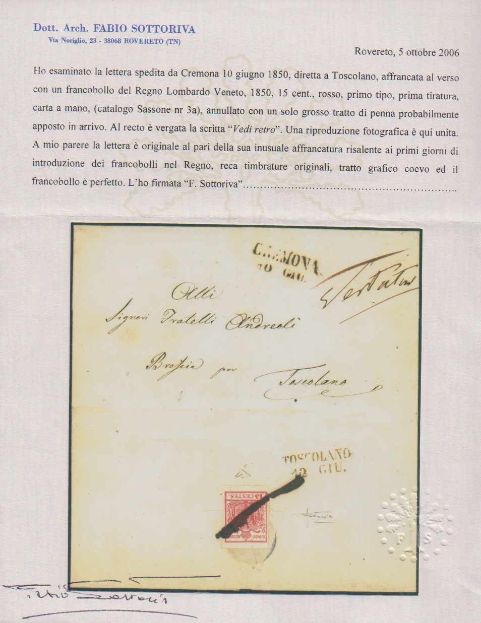 15 C. rosa, Handpapier, Erstauflage, Kabinettstück rückseitig auf frühem Brief mit vs. L2 "Cremona" vom 10. Juni 1850, die rückseitige Marke nur mit Federzug entwertet. Sign. Diena und Sottoriva mit Attest