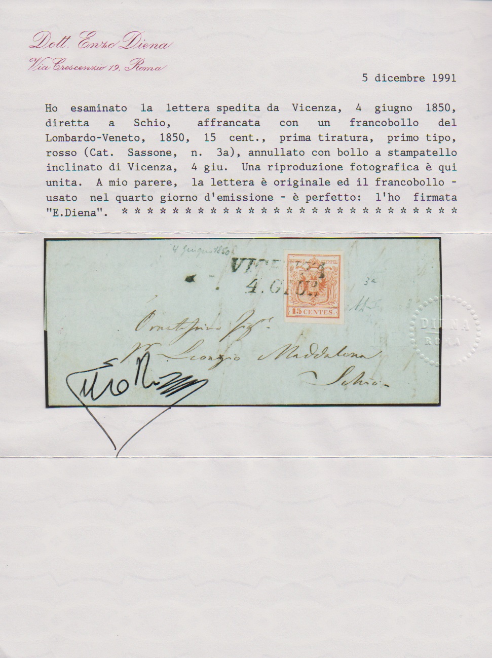 15 C. rosa, Handpapier, Erstauflage, breitrandiges Kabinettstück auf sehr frühem Brief mit L2 "Vicenza" vom 4. Juni 1850 (Inhalt v. 2. Juni) nach Schio, sign. Diena mit Attest
