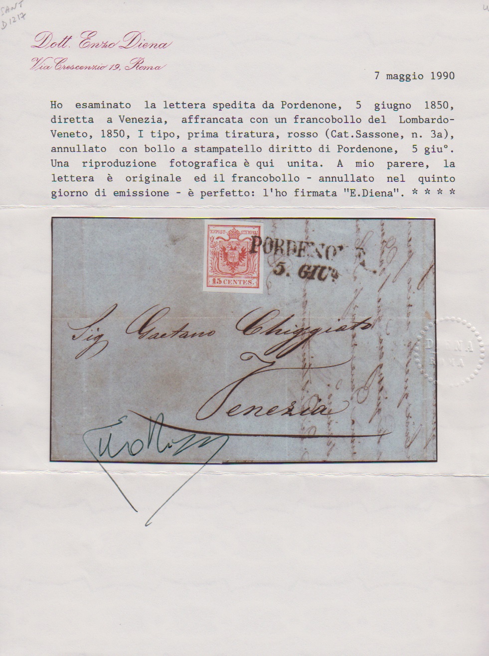 15 C. rosa, Handpapier, Erstauflage, fast bildfrei gestempeltes Kabinettstück auf frühem gefaltetem Brief mit L2 "Pordenone" vom 5. Juni 1850 nach Venezia, Müller 196a. Sign. Diena mit Attest