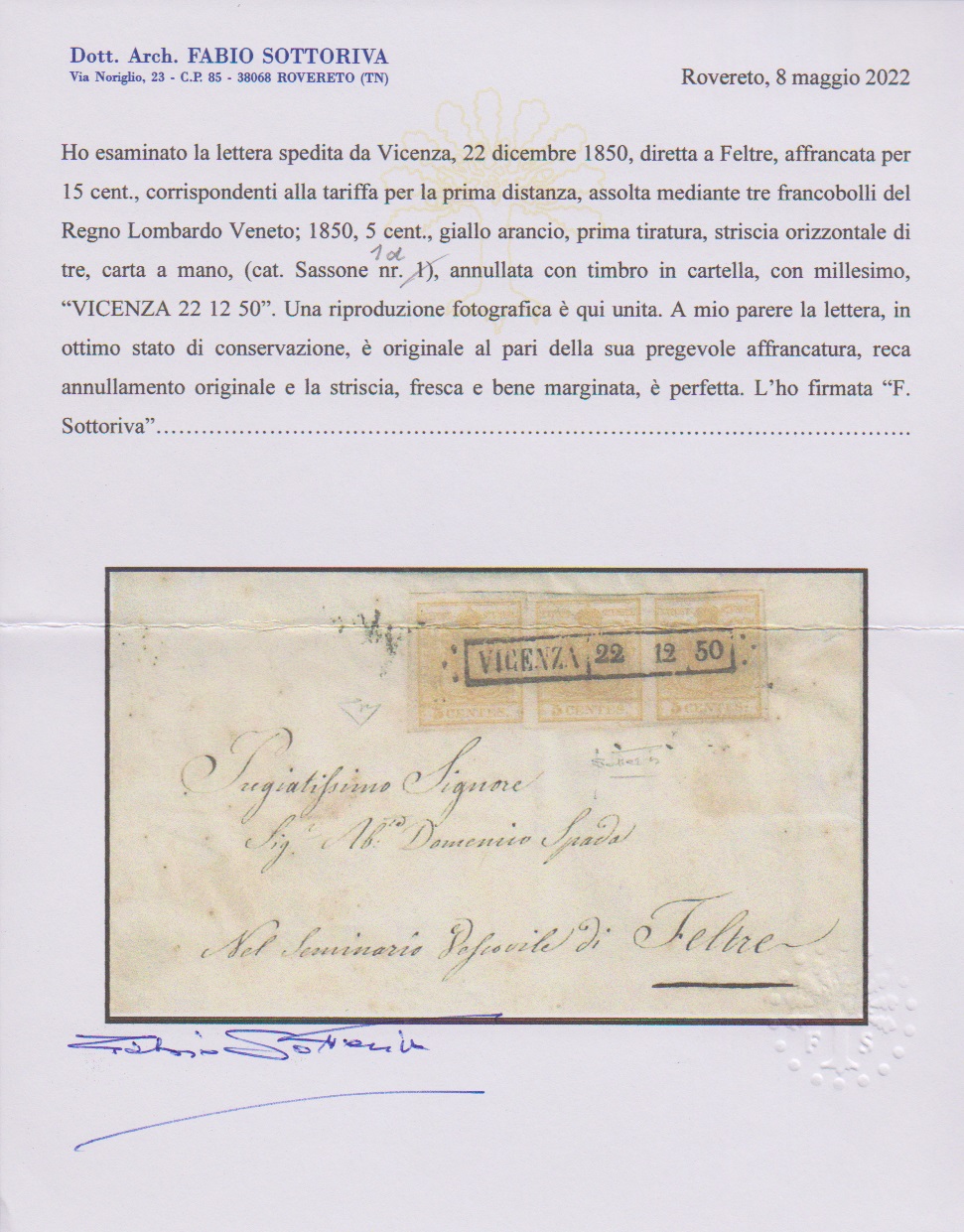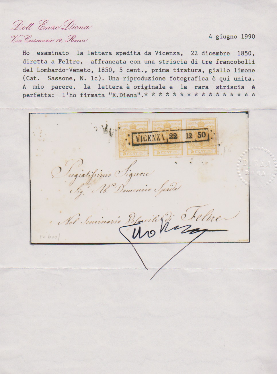 5 C. gelborange, Handpapier, Pracht-Dreierstreifen auf etwas fleckigem Briefchen mit idealem Stab-Ra1 "Vicenza", 22.12.1850, nach Feltre. Atteste Ferchenbauer, Diena und Sottoriva (je "perfetta")