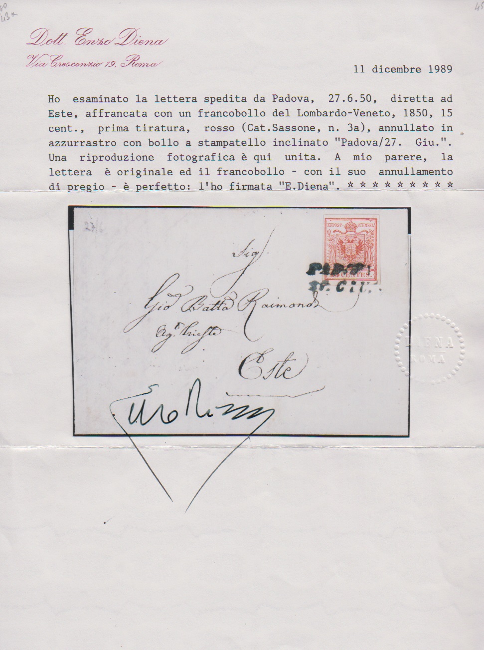 15 C. rosa, Handpapier, Erstauflage, auf frühem Prachtbrief mit blauem L2 "Padova" vom 27. Juni 1850 (Ausgabemonat), Attest Diena, Müller 174a/b