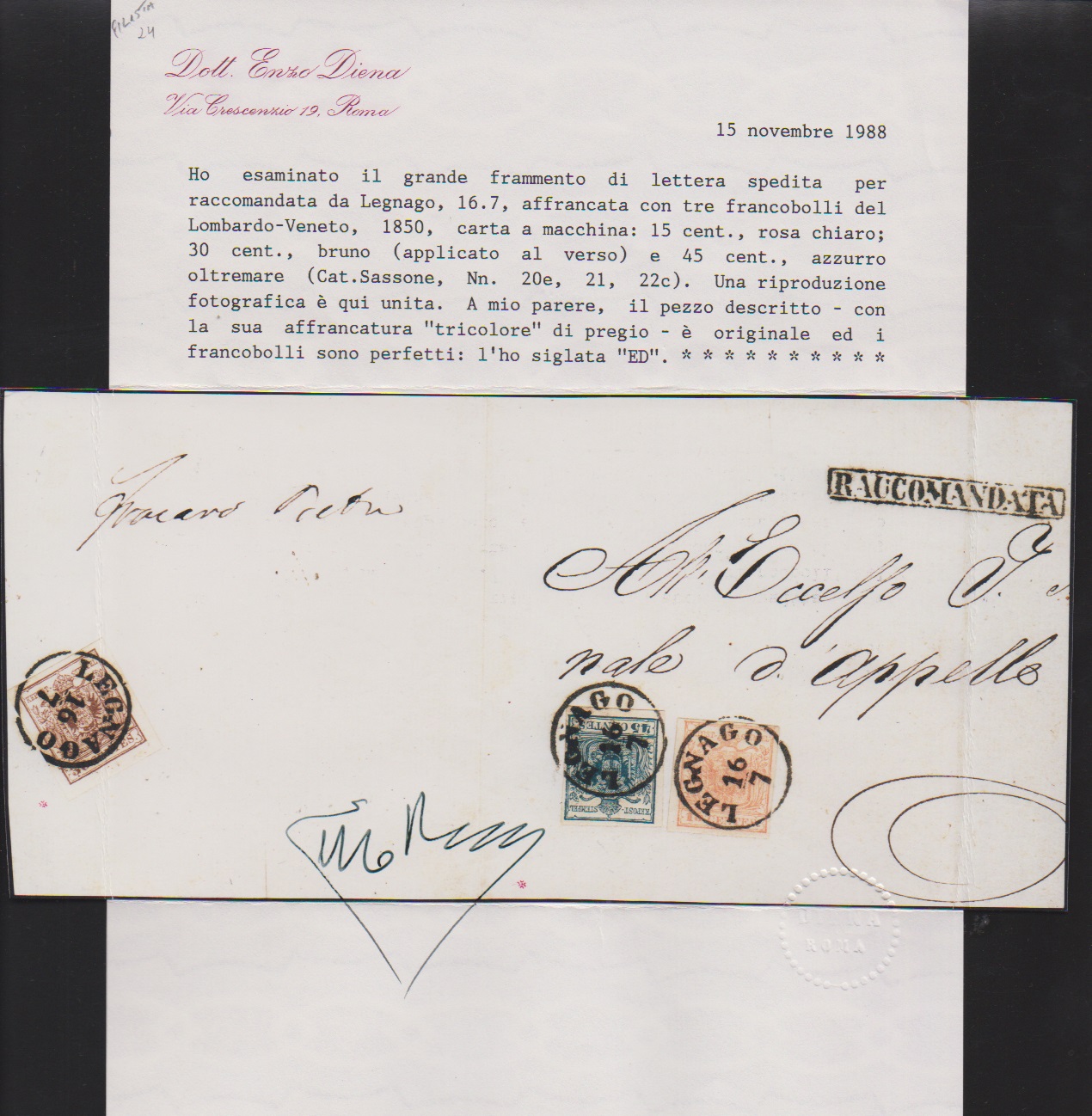 15 C. rosa und 45 C. blau vorderseitig, 30 C. braun als Recogebühr rückseitig, alles Kabinettstücke auf Maschinenpapier, auf großem Reco-Briefteil mit K1 "Legnago", Attest Diena, Müller 124b