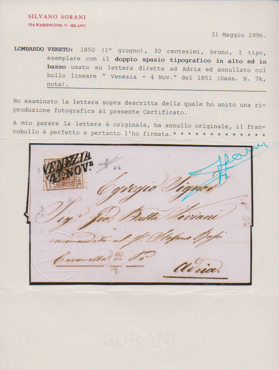 30 C. braun, Handpapier, Kabinettstück mit sowohl Druckspieß oben als auch unten auf Faltbrief mit L2 "Venezia" nach Adria, sign. mit Attest Sorani (Sassone 7k)