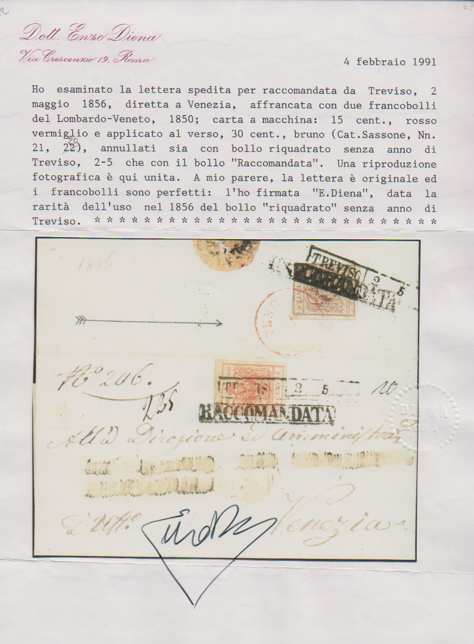 15 C. rosa vs., rs. 30 C. braun, beide Maschinenpapier, auf Recobrief mit Doppelentwertung durch Stab-Ra1 "Treviso" und Ra1 "Raccomandata", die rückseitige 30 C. (etwas Randlinienschnitt) zusätzlich roter K1 "Venezia". Adressname gelöscht, Attest Diena