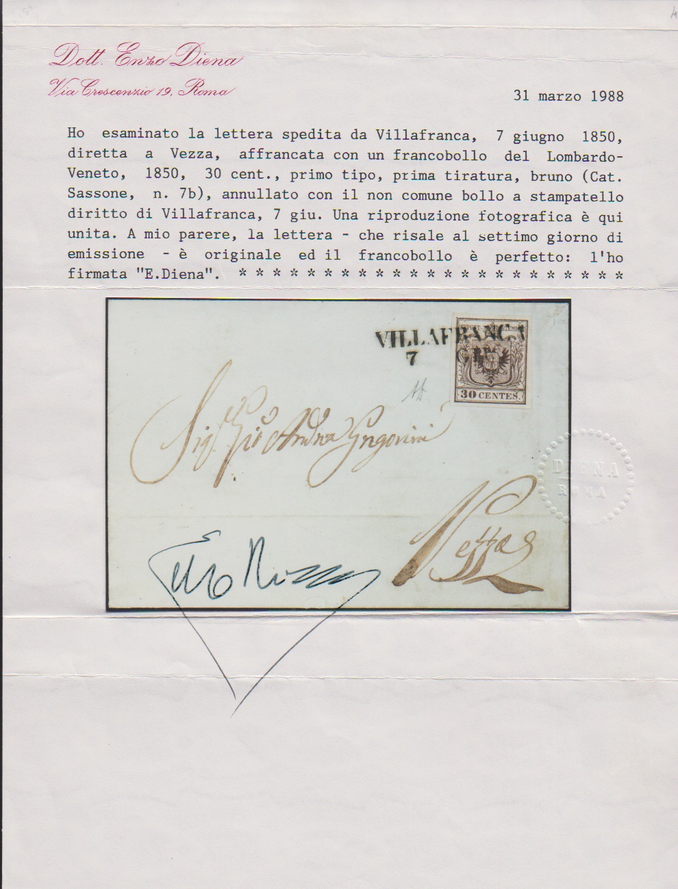 30 C. braun, Handpapier, Erstauflage, auf frühem Kabinettbrief mit L2 "Villafranca" vom 7. Juni 1850, sign. Diena mit Attest, Müller 270a