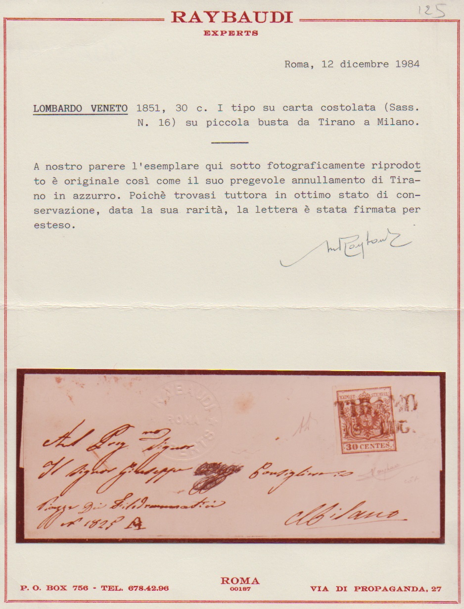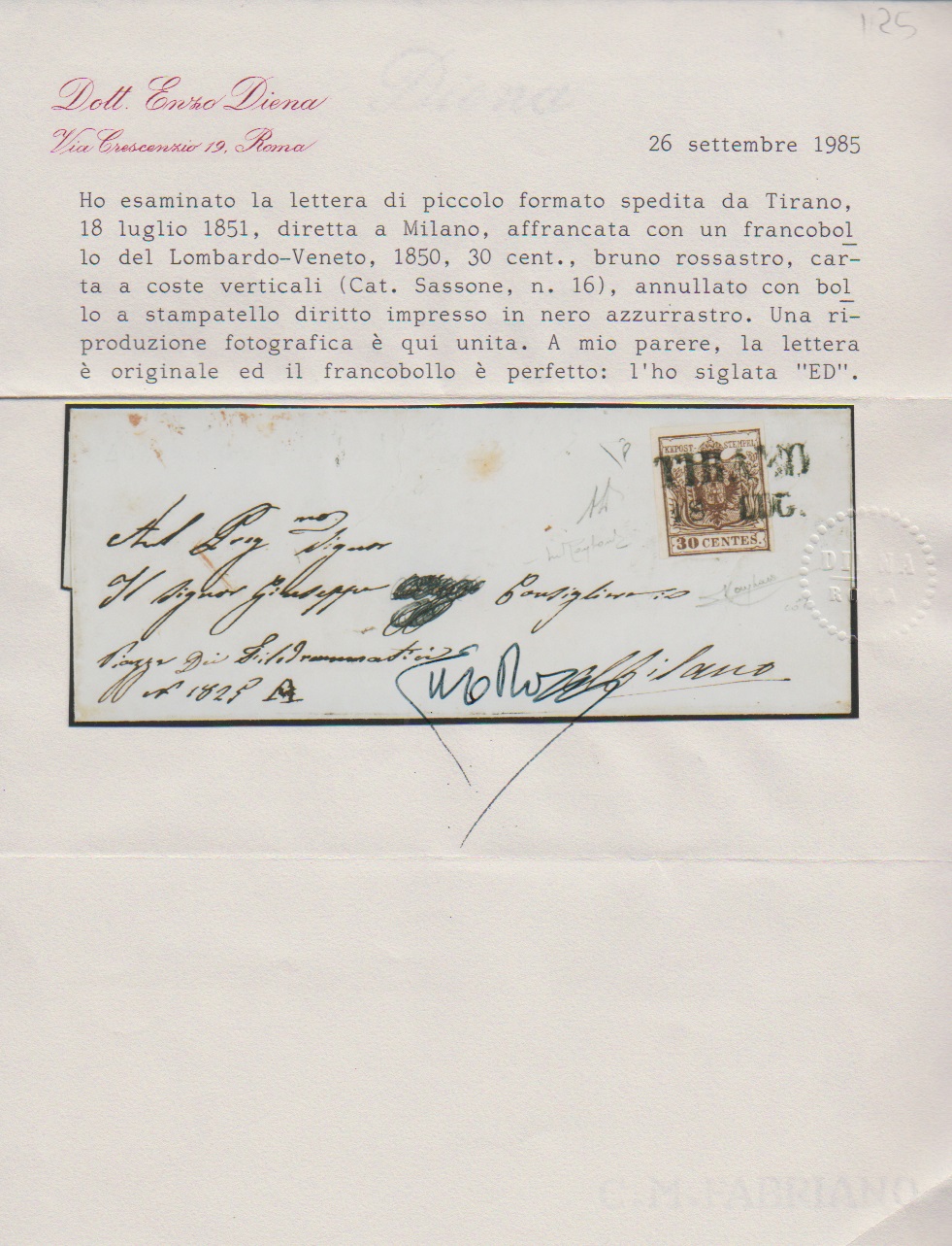30 C. braun, Handpapier, Prachtstück auf kleinem Briefchen (unauffälliger Randriß) mit blauem L2 "Tirano" 1851 nach Mailand. Seltener Stempel, Müller 241b, 140 P. Atteste Raybaudi, Diena