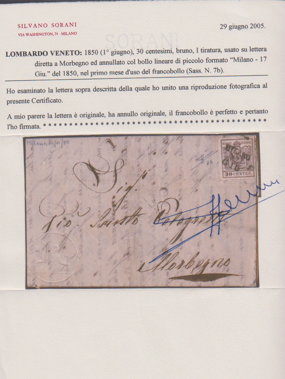 30 C. braun, Handpapier, Erstauflage, auf frühem Prachtbrief mit L3 "Milano" vom 17. Juni 1850, Attest Sorani