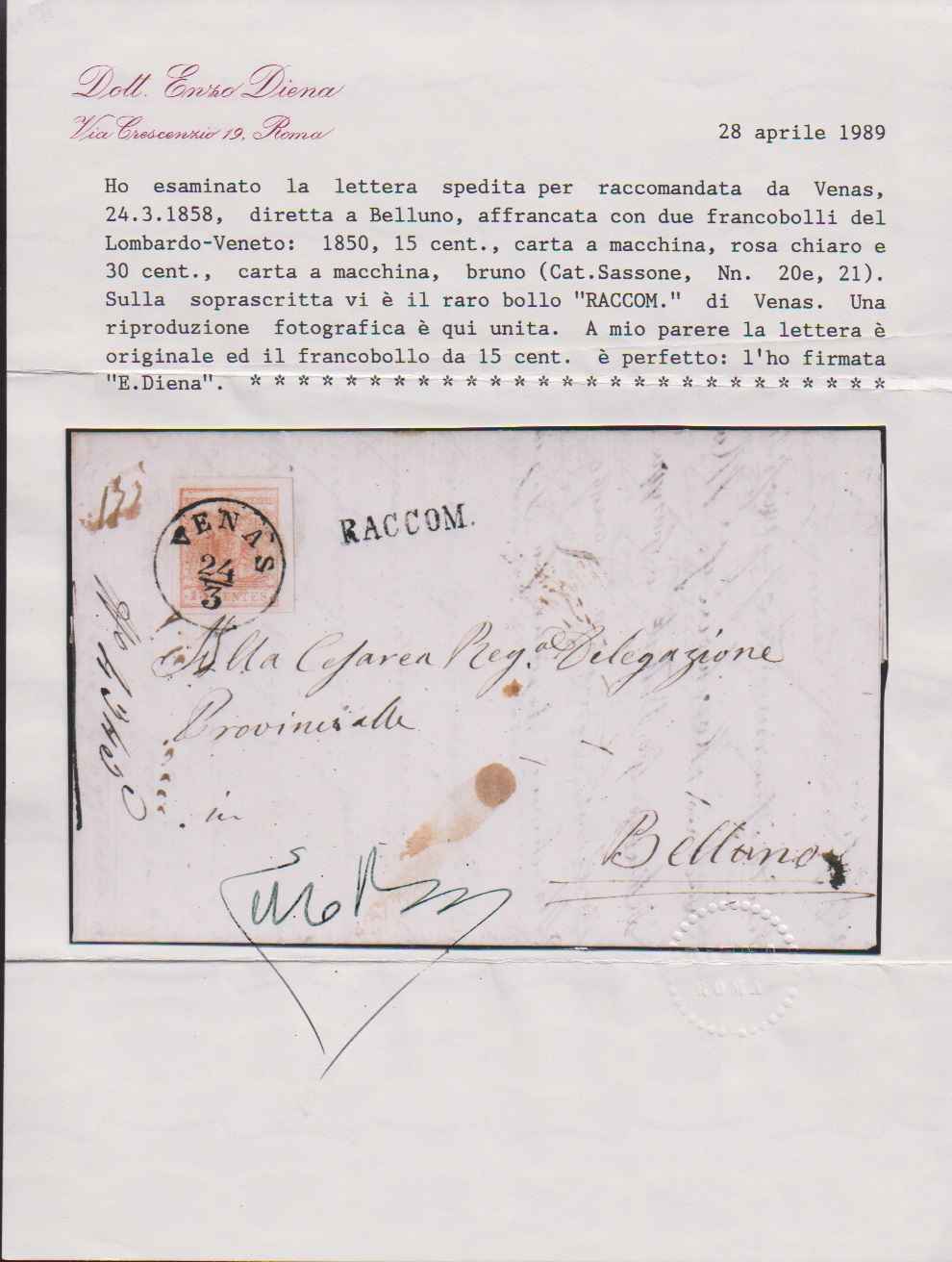 15 C. rosa, Maschinenpapier, Kabinettstück vorderseitig, rückseitig beim Öffnen getrennte 30 C. braun, auf Recobrief mit seltenem K1 "Venas" 1858, Atteste Sottoriva, Diena