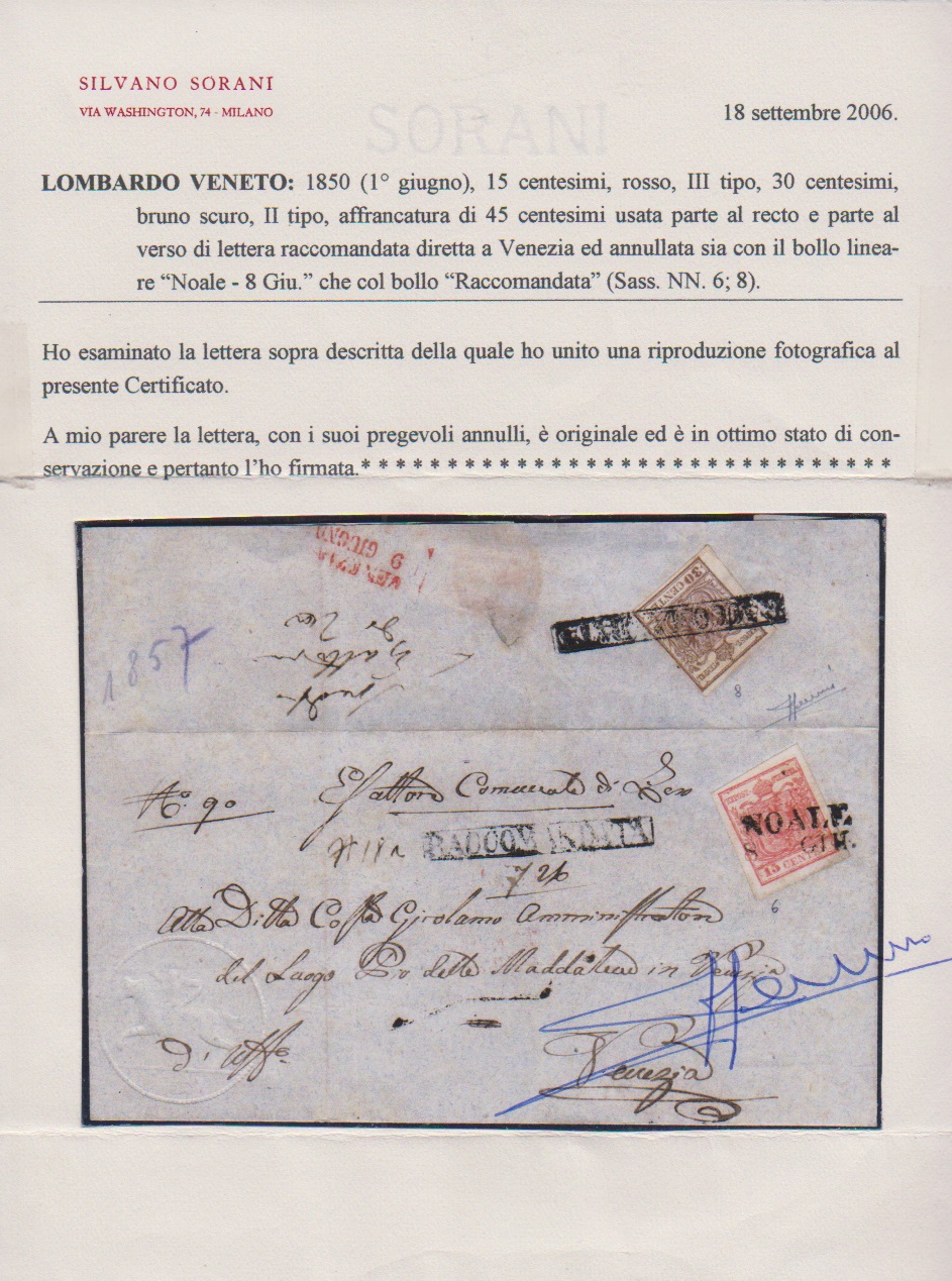 15 C. rosa, Maschinenpapier, breitrandiges Kabinettstück mit L2 "Noale" vorderseitig, rückseitig 30 C. braun als Recogebühr nur mit Ra1 "Raccomandata", auf dekorativem Recobrief nach Venezia. Attest Sorani