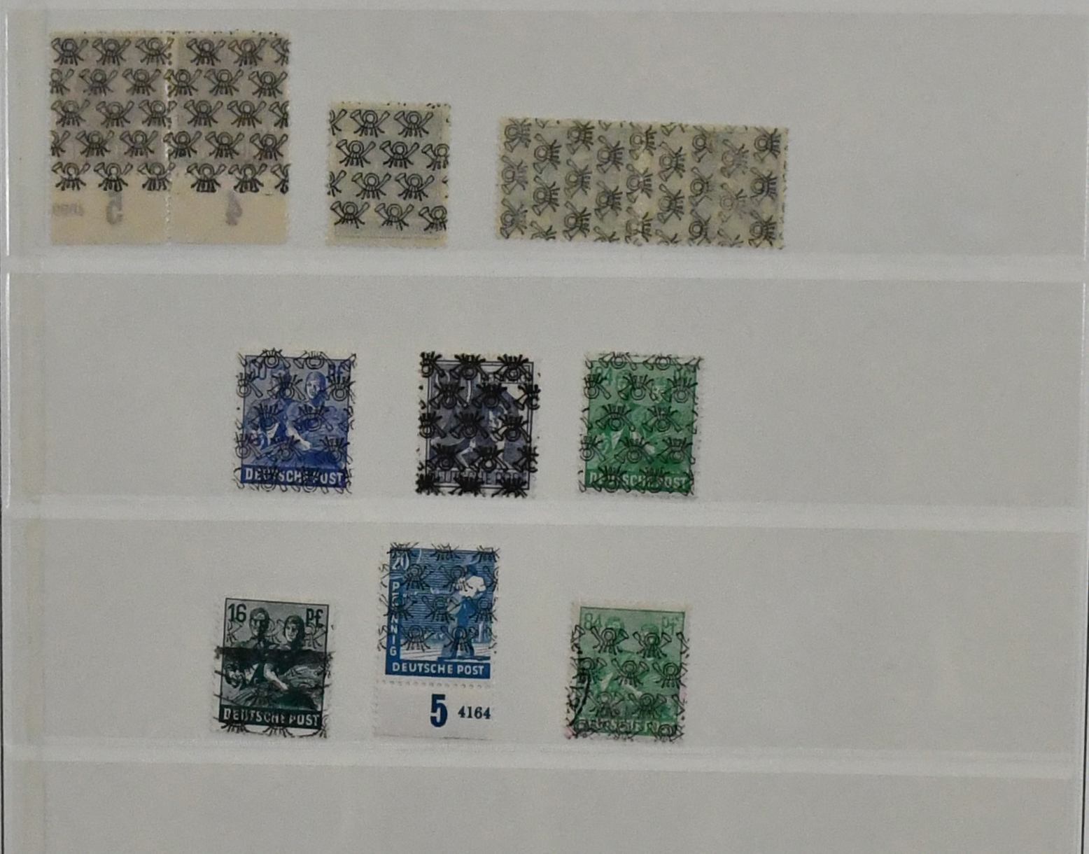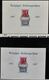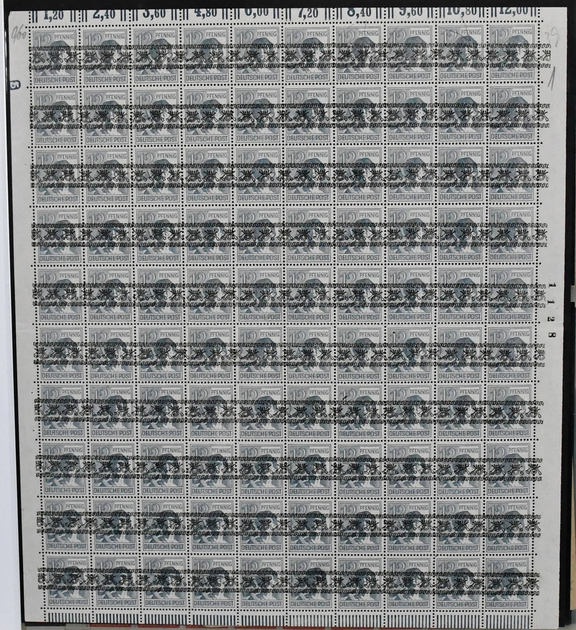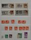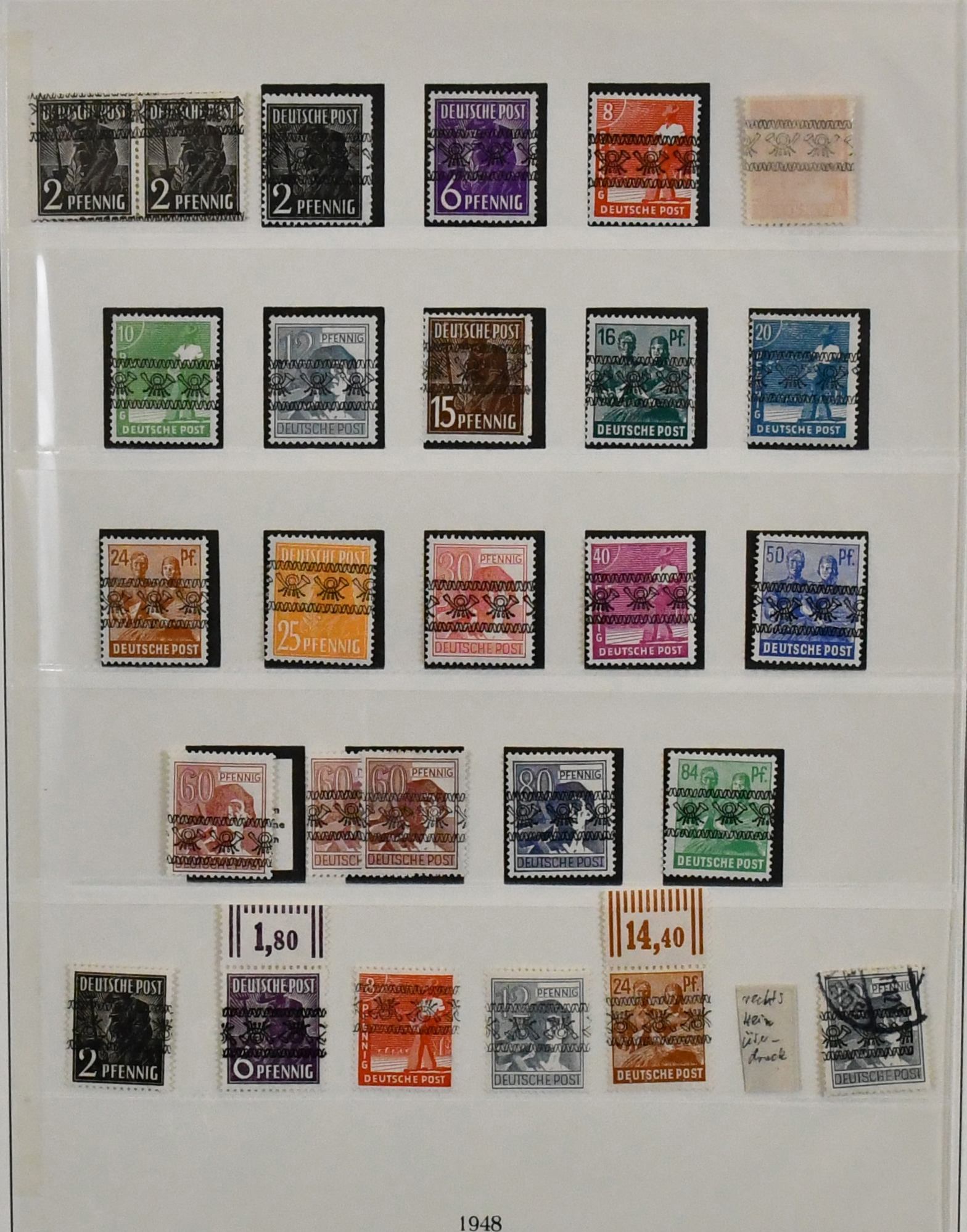 DDR, 1949-1990, postfrisch überkomplette Slg. in sechs roten Lindner-Falzlos-Alben, immer wieder ergänzt mit z.B. Debria-Block (Bl. 7) auf Brief, Zusammendruckbogen, Schwarzdrucken, Zus.-Drucken etc., zusätzlich noch etliches gestempelt auf Vordruckseiten, ferner komplette Slg. Zusammendrucke, vorweg schon Zusammendrucke aus MHB ab Fünfjahresplan und Blöcken ab Debria, ergänzt durch ein Lager Druckvermerke der Zus.-Drucke in einem Ordner und einem dicken Lagerbuch mit teils besseren Dublettenbeständen wie Trachten, sowie einige kleinere Besonderheiten, Lokalausgaben etc. (400,-)