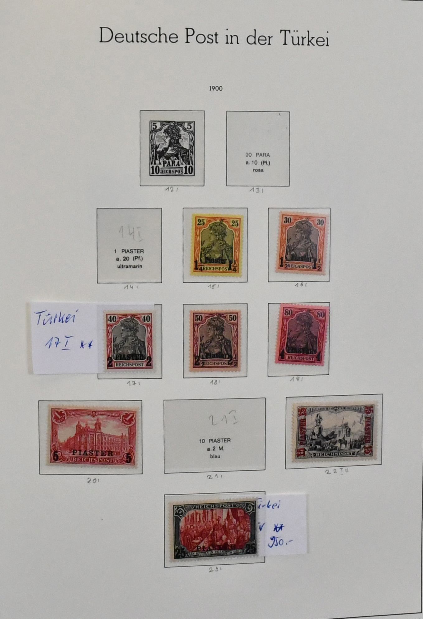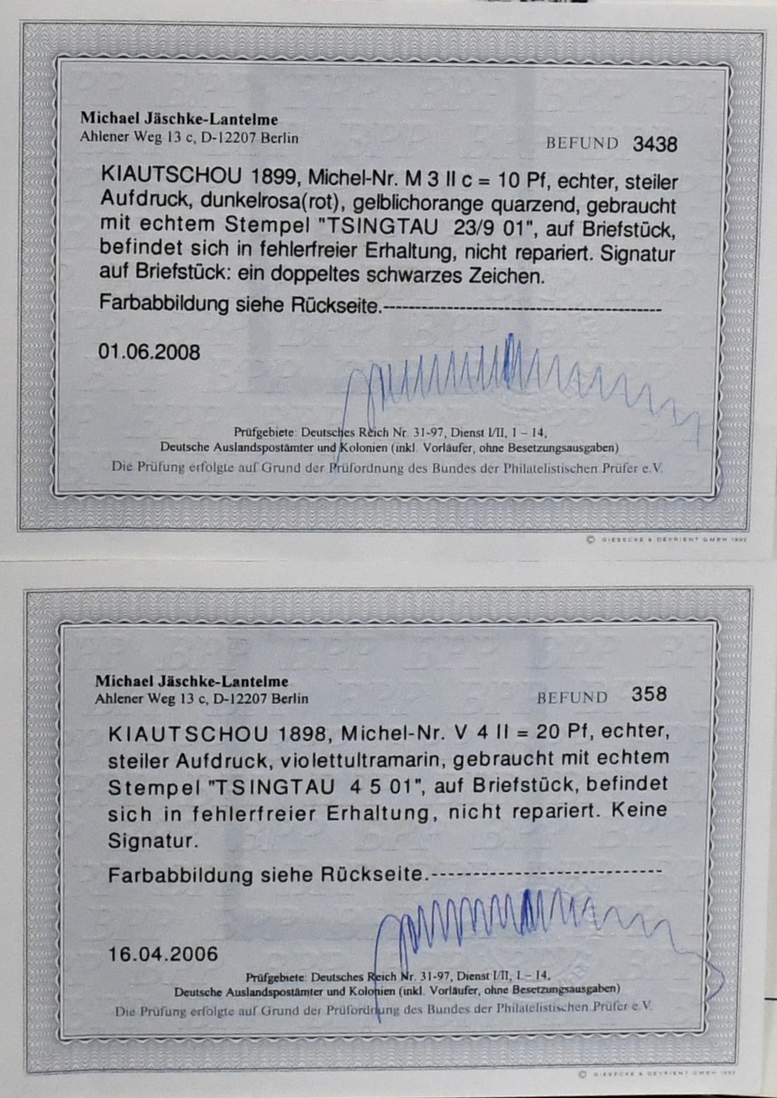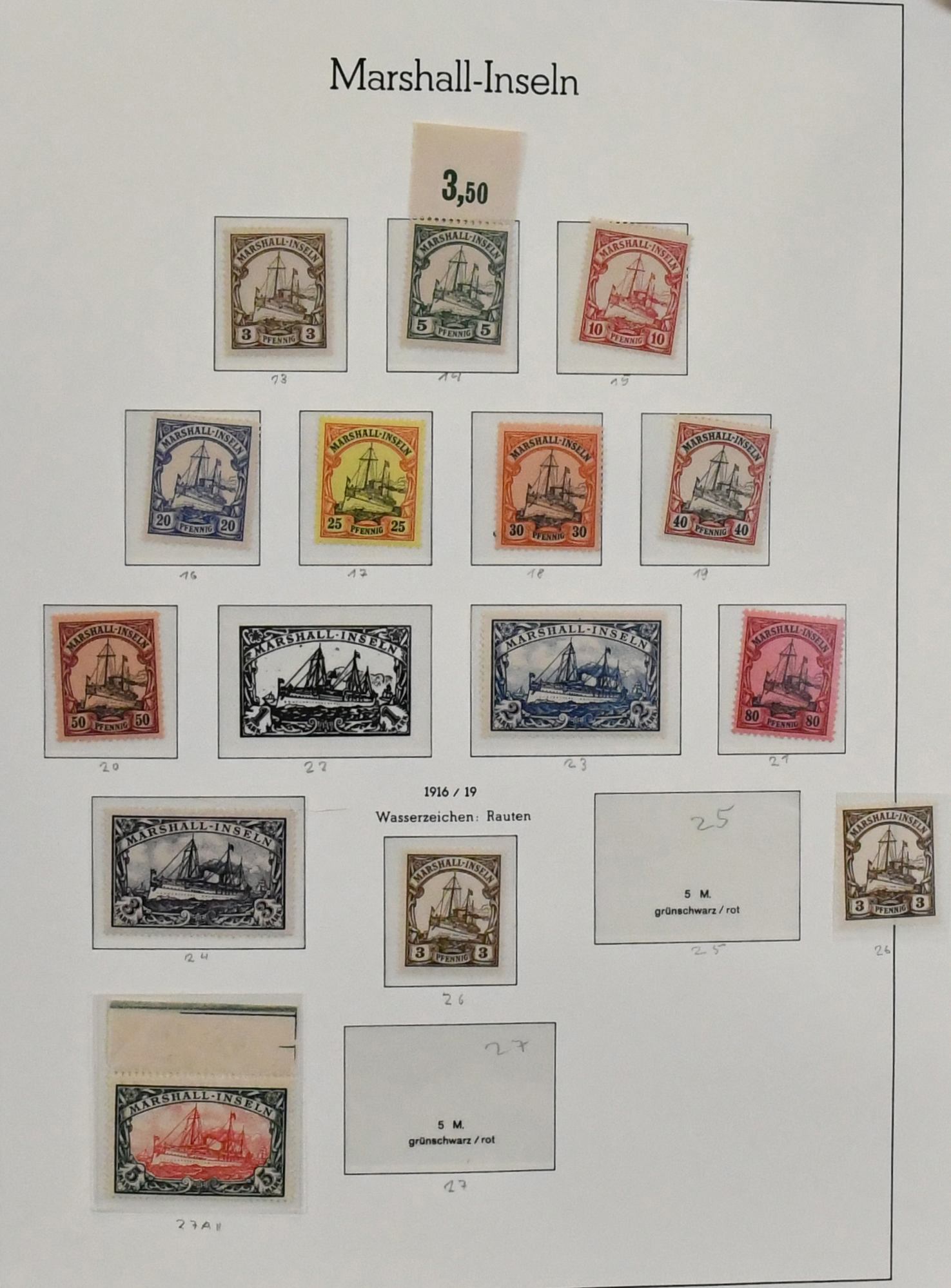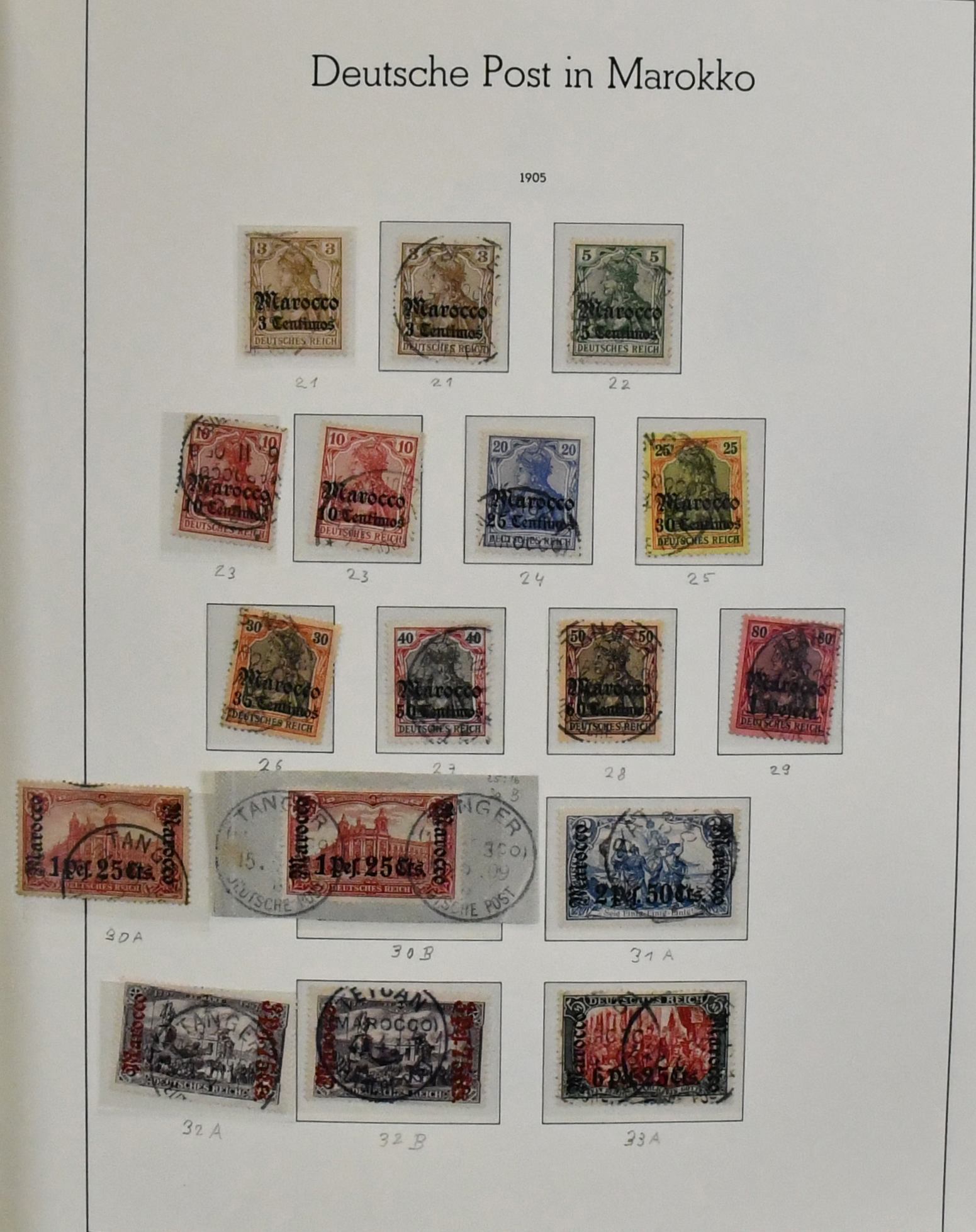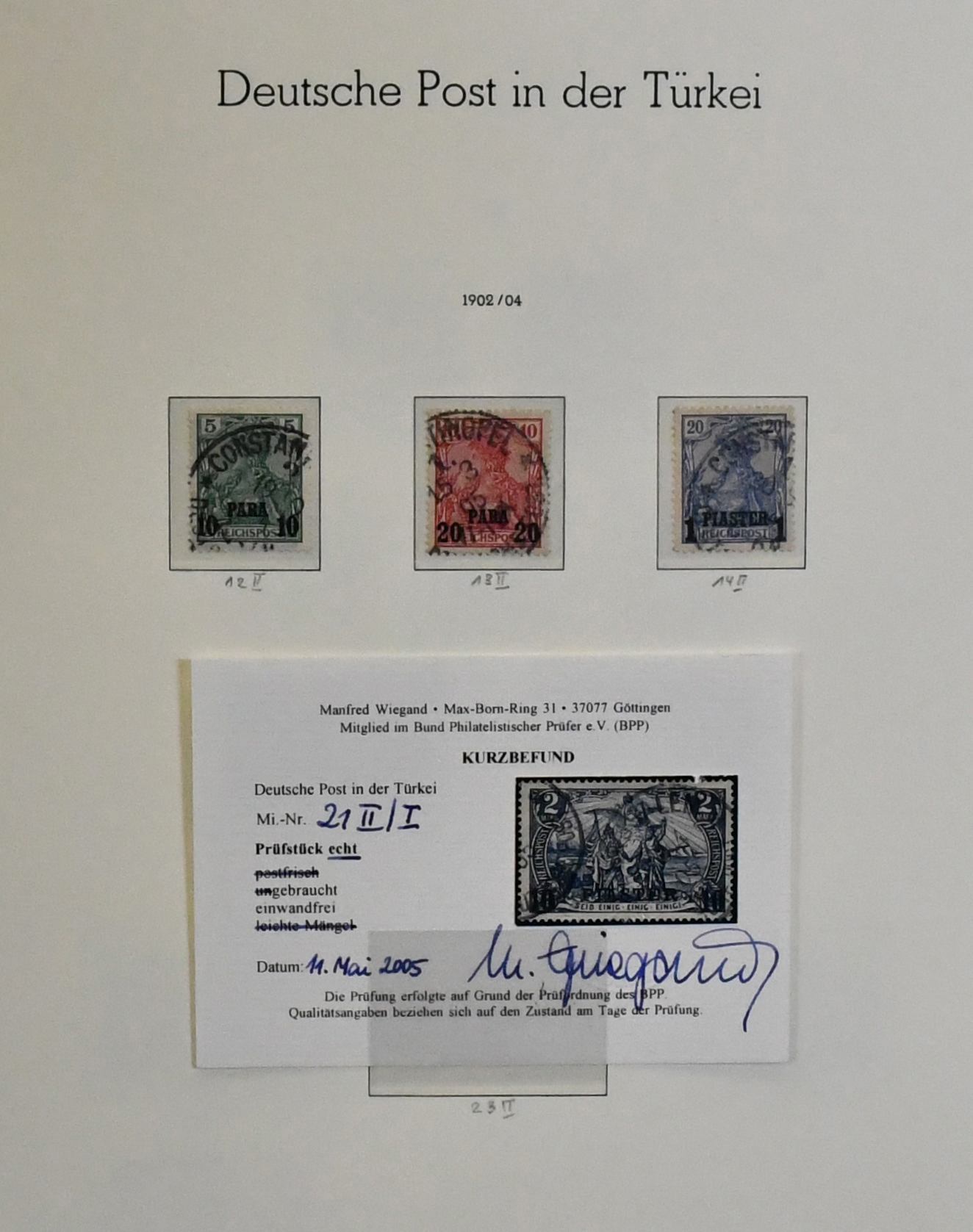 Deutsche Kolonien und Auslandspostämter, sehr umfangreiche und oft gut besetzte Sammlung mit vielen geprüften Werten (Atteste/Befunde) in zwei Bänden, gestempelt und zusätzlich postfr./ungebr., dabei gestempelt fast kpl. mit nahezu allen 5 Mk.-Werten, zusätzlich mit vielen Vorläufern und Krone-Adler-Farben, z.B. China Futschau Nr. 7I u. II mit Attesten, 1IIe mit Attest Jäschke, Marokko Nr. 3b, e, 19IV mit Attest Steuer, 33A Befund, Türkei V37f, 21II, 23, DOA, DSWA Nr. 9a, b, Atteste, 32Aa gepr., Karolinen Nr. 19, Kiautschou Nr. 3IIc, 4II mit Befunden, Tsingtau-Ausgaben, Nr. 17 gepr., Marianen Nr. 1/6II auf Brief usw., ähnlich ungebr./postfr. (hier teils unterschiedlich), dazu Lagerbestand mit ebenfalls guten Werten (3000,-)