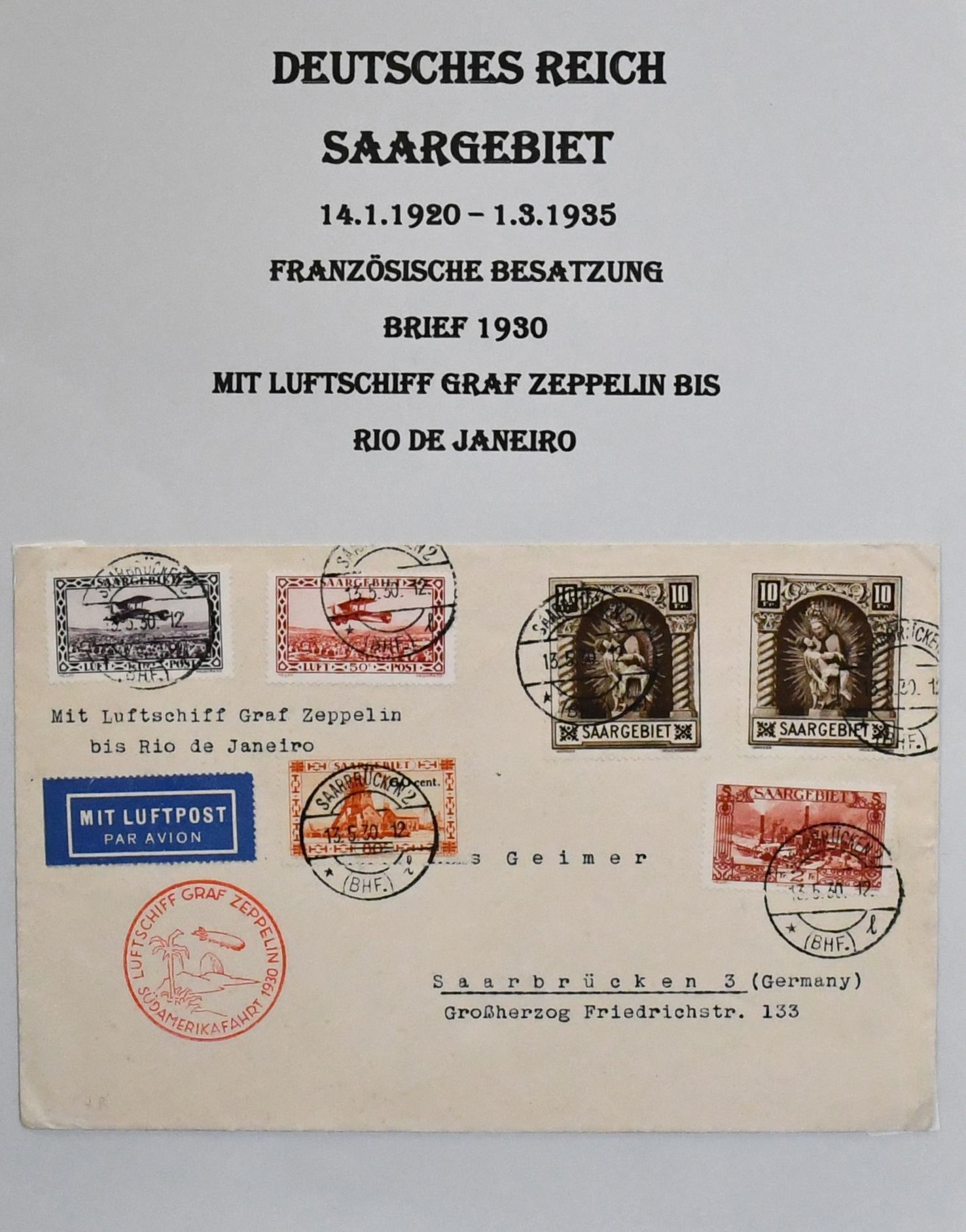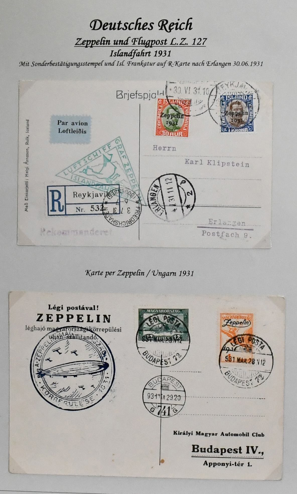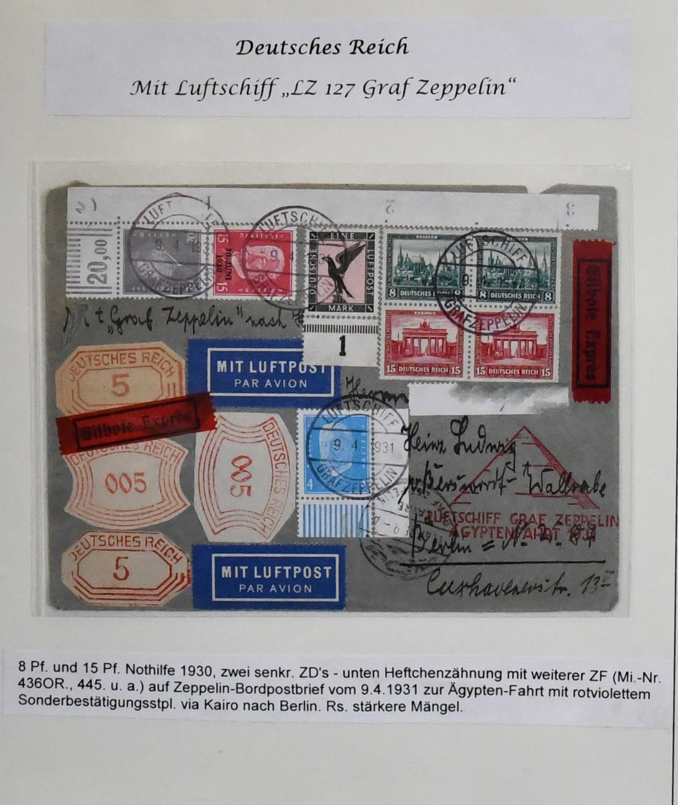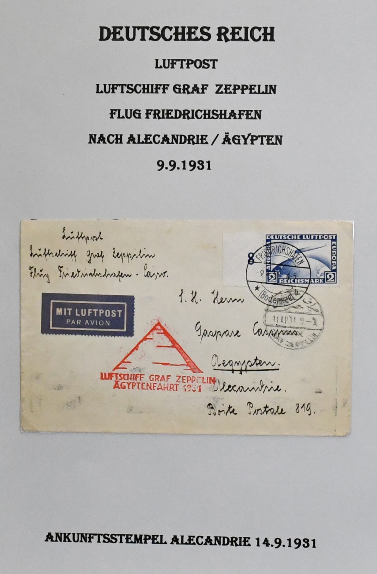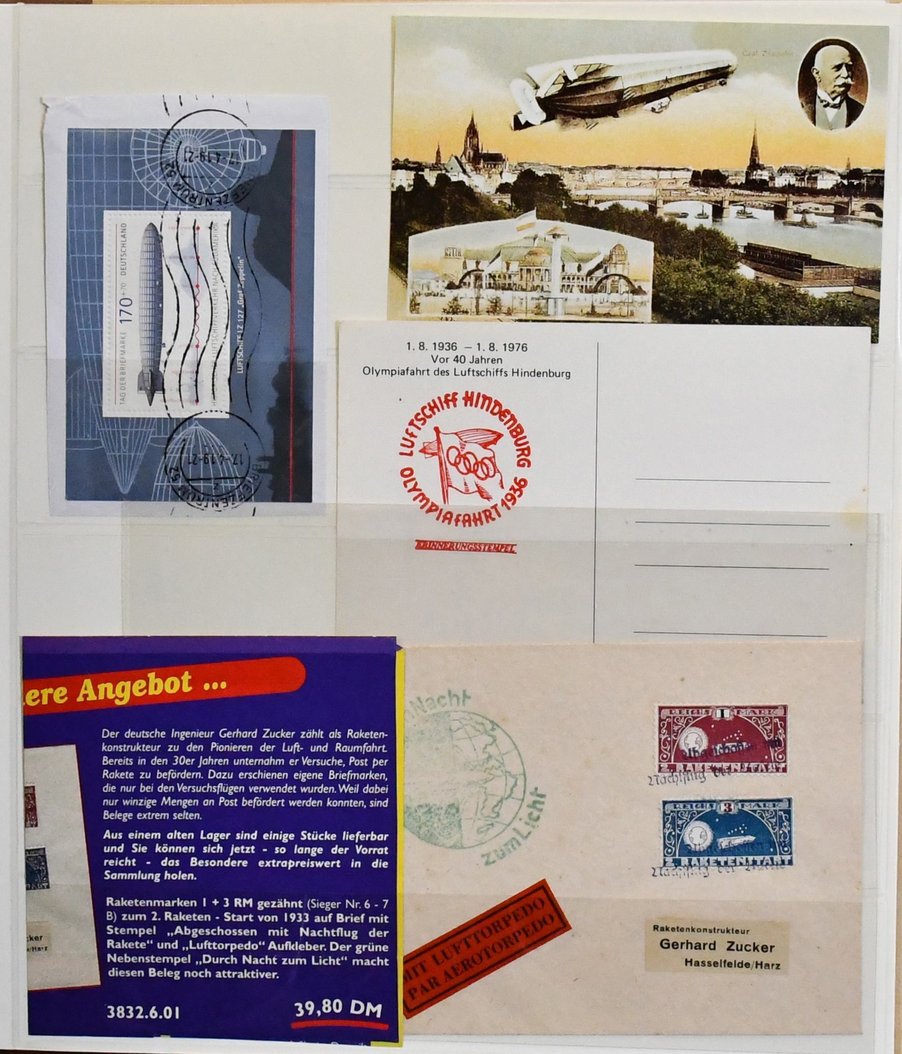 Deutschland vor 1945, dreibändige und praktisch ausstellungsfähige Sammlung, sehr schön aufgemacht und illustriert, dabei interessanter Teil Feldpost 1./2. Wk., u.a. Kolonien, der Wertschwerpunkt liegt bei einer Zeppelin-Sammlung mit Ansichtskarten, versch. Fahrten mit Weltrundfahrt, Zuleitungen mit Saar, Polarfahrt, Südamerikafahrt mit Deutsches Reich Nr. 439, Island- und Ungarnfahrt u.v.m. (600,-)