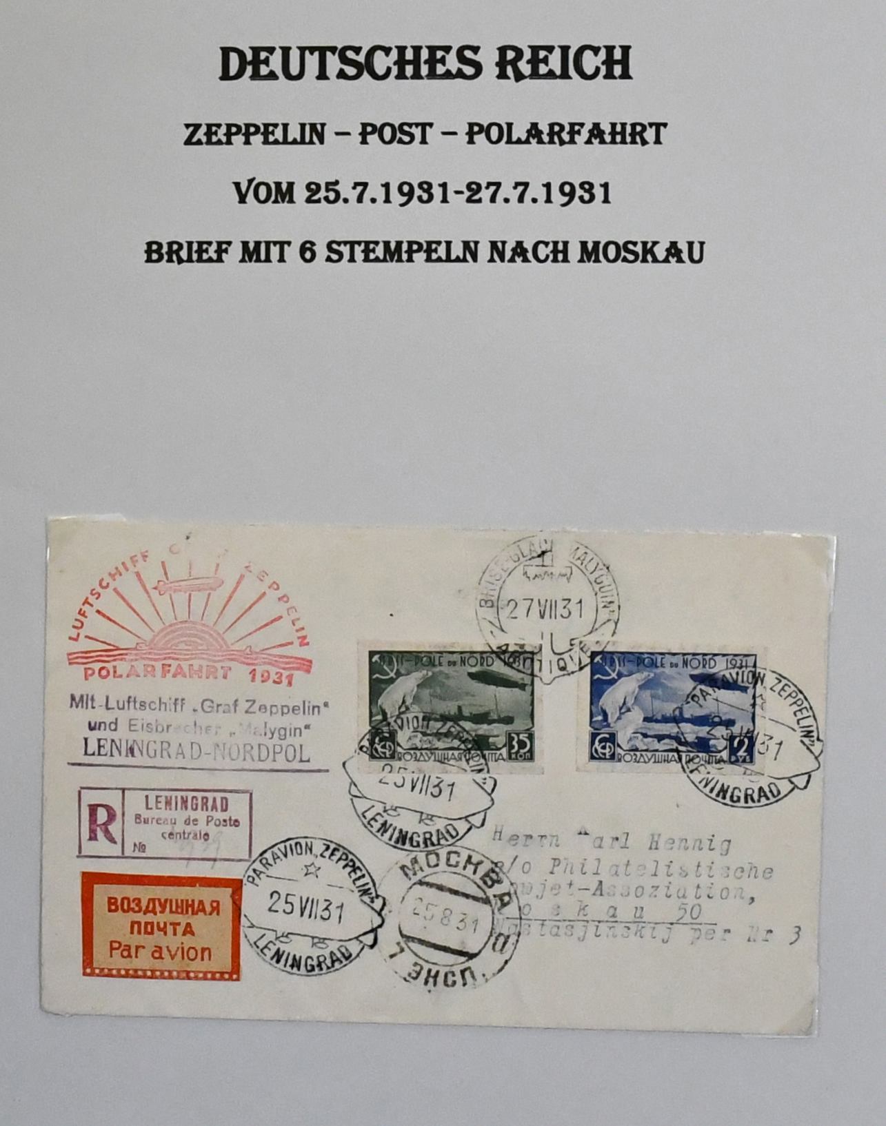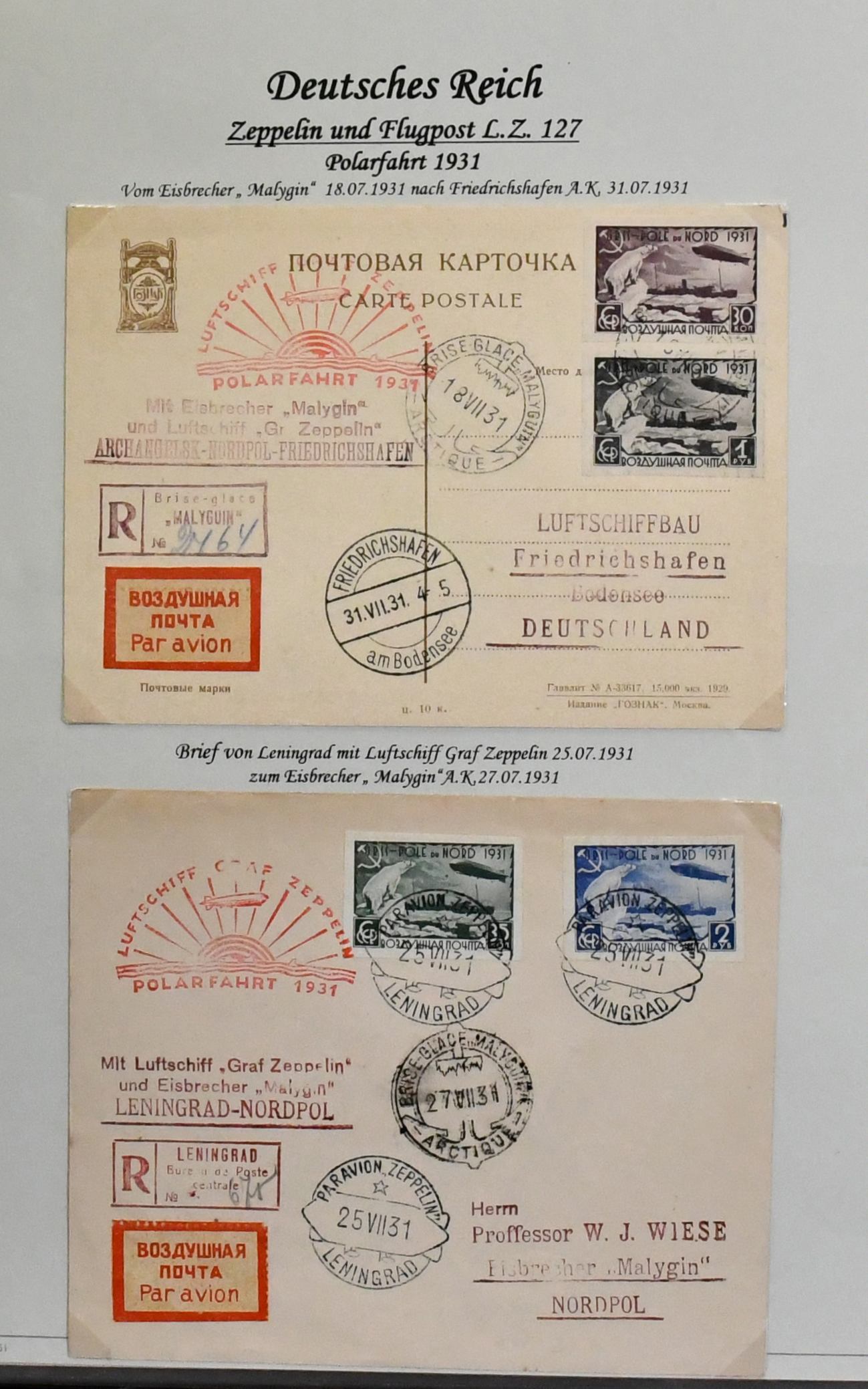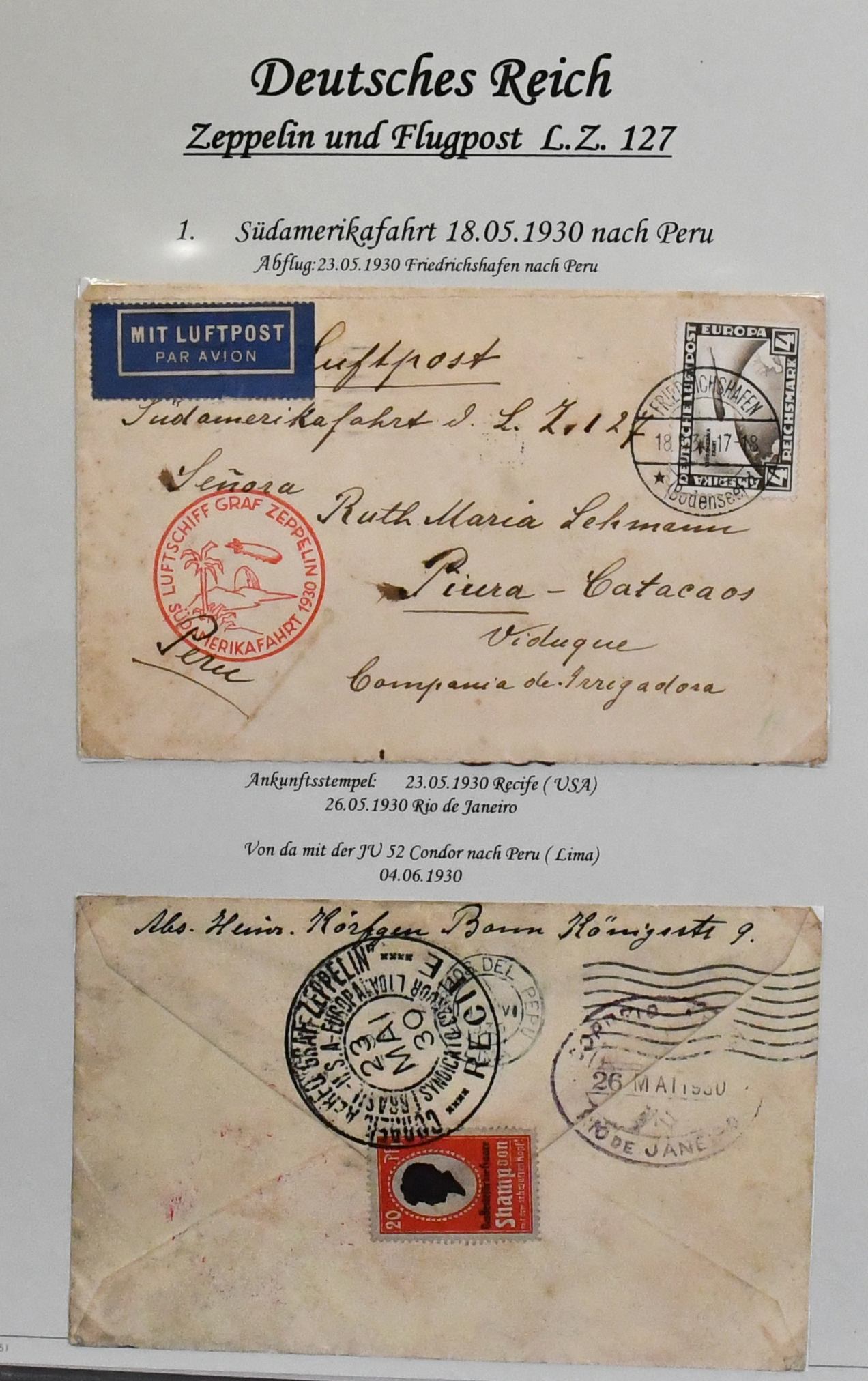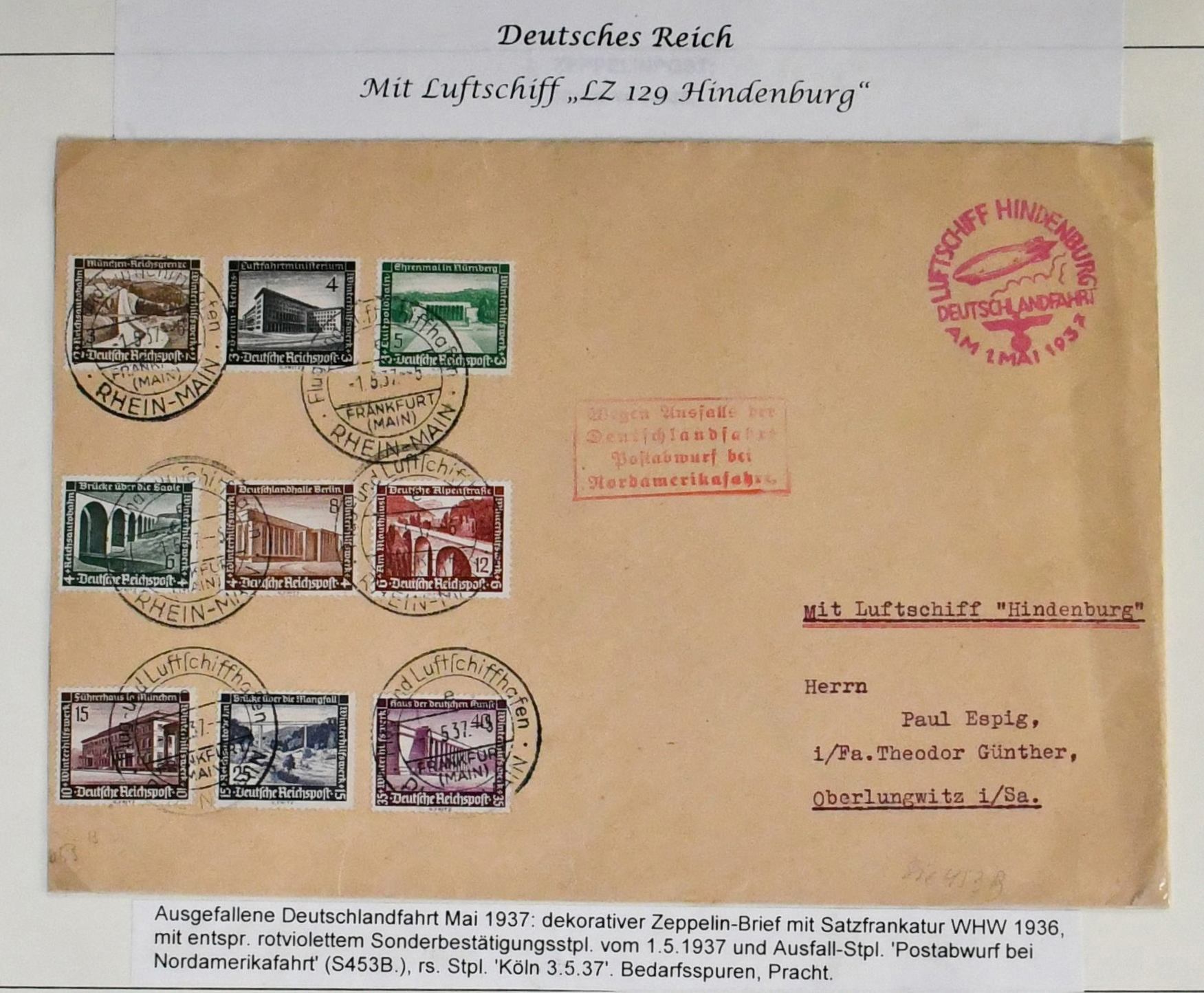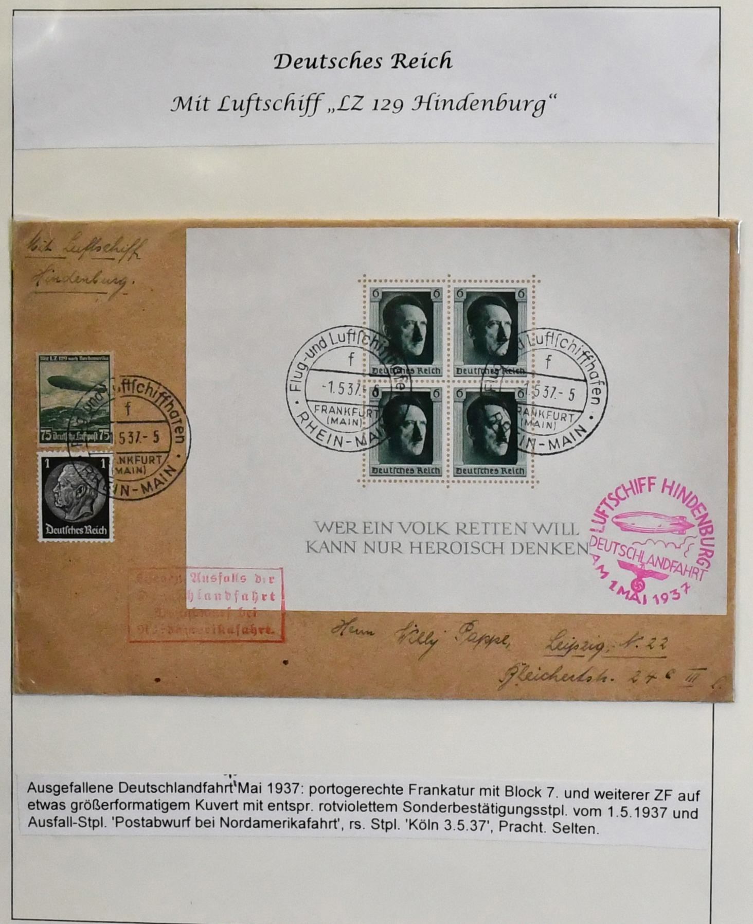 Deutschland vor 1945, dreibändige und praktisch ausstellungsfähige Sammlung, sehr schön aufgemacht und illustriert, dabei interessanter Teil Feldpost 1./2. Wk., u.a. Kolonien, der Wertschwerpunkt liegt bei einer Zeppelin-Sammlung mit Ansichtskarten, versch. Fahrten mit Weltrundfahrt, Zuleitungen mit Saar, Polarfahrt, Südamerikafahrt mit Deutsches Reich Nr. 439, Island- und Ungarnfahrt u.v.m. (600,-)