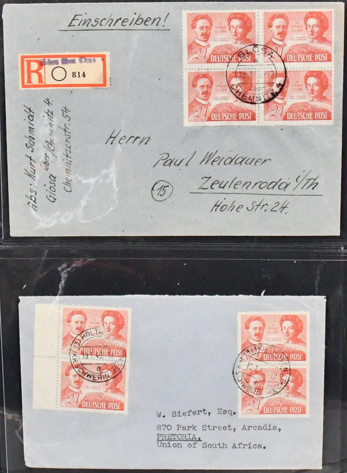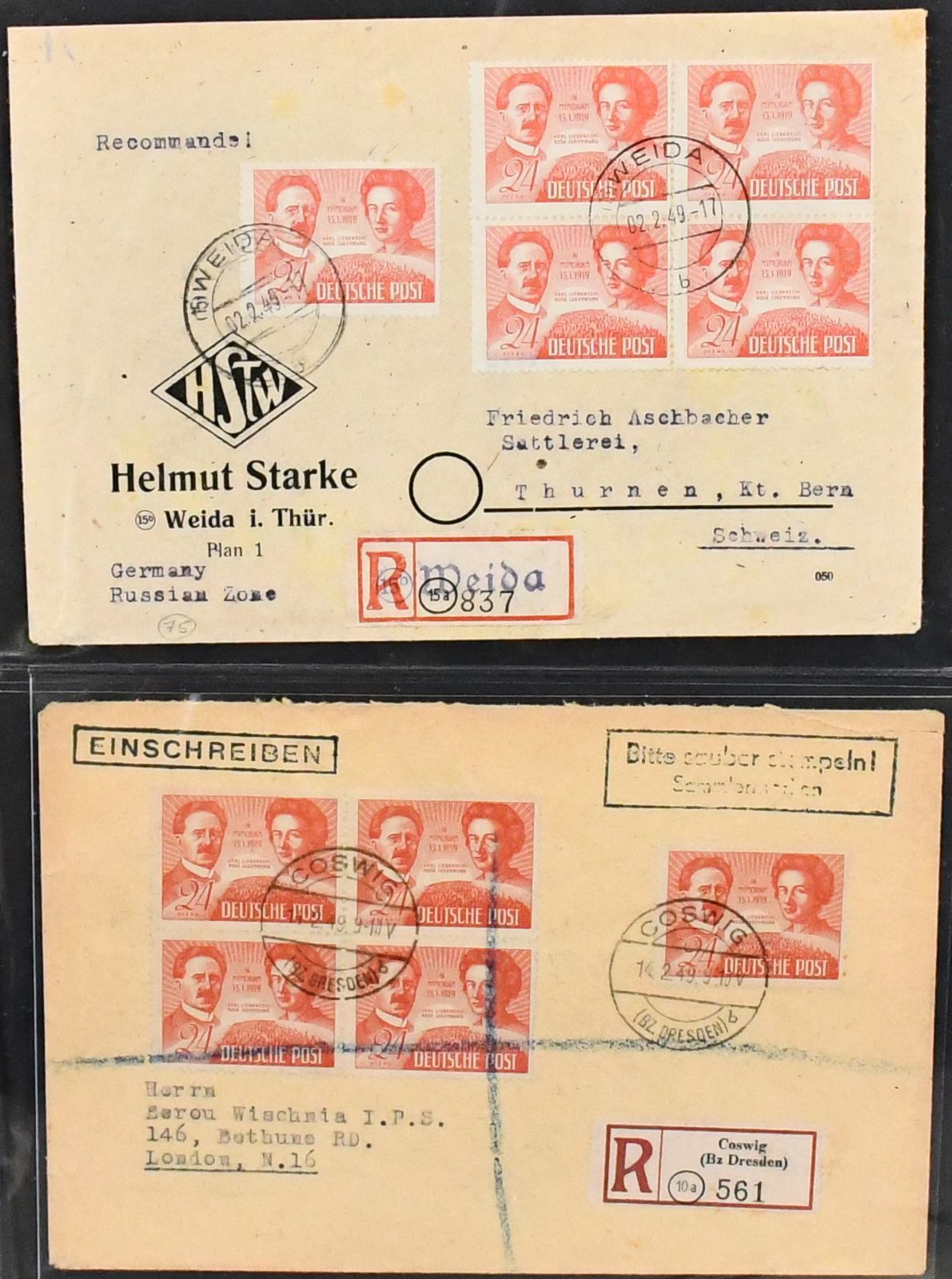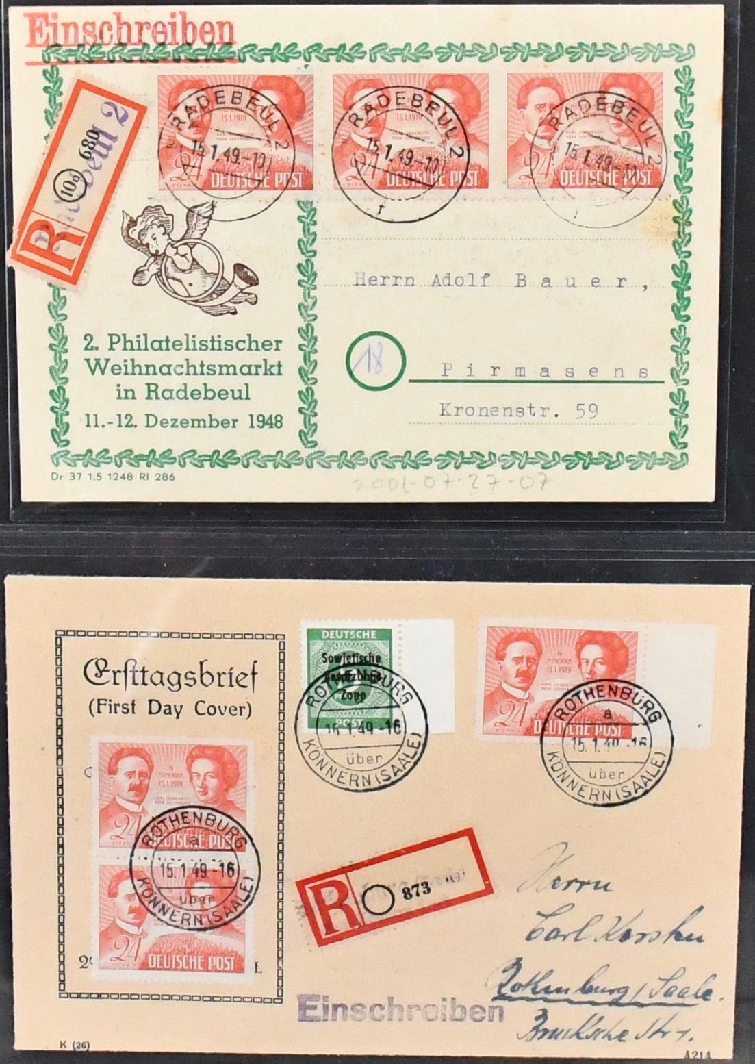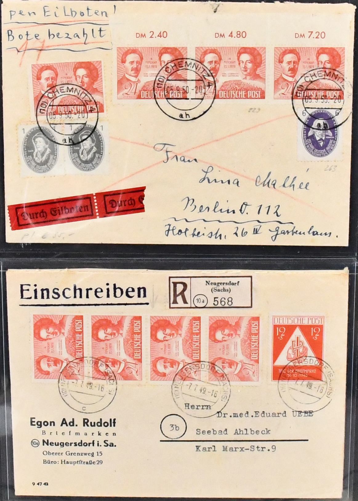 SBZ, Mi.-Nr. 229, 24 Pfg. Liebknecht/Luxemburg, Spezialslg. von rund 140 Belegen, dabei eine Vielzahl von FDCs, u.a. eine Karte FDC Berlin-West, wohl Unikat, zwei weitere Verwendungen in West-Berlin (Mi. je 1600,-), diverse hohe MeF, DV/DZ, Plattenfehler usw. Reizvolles Los! (600,-)