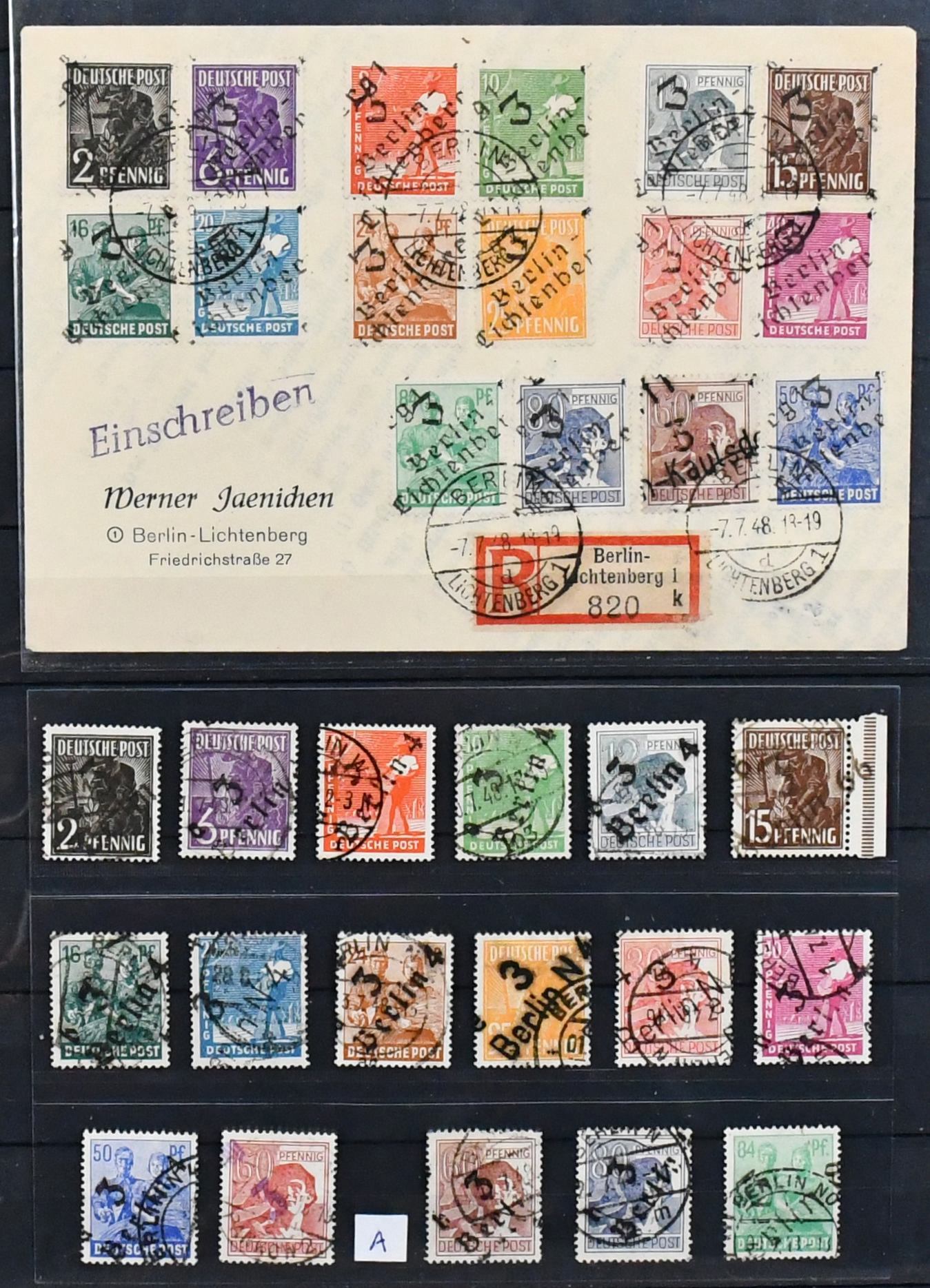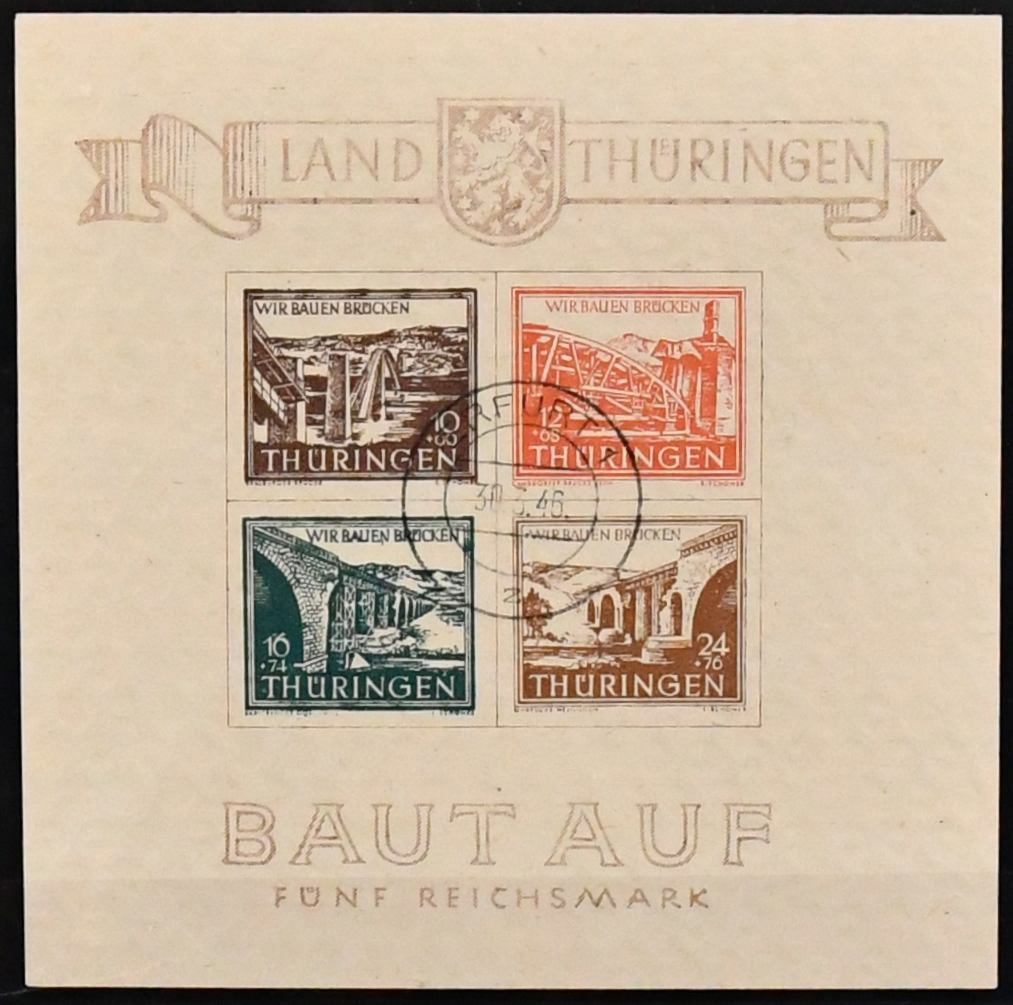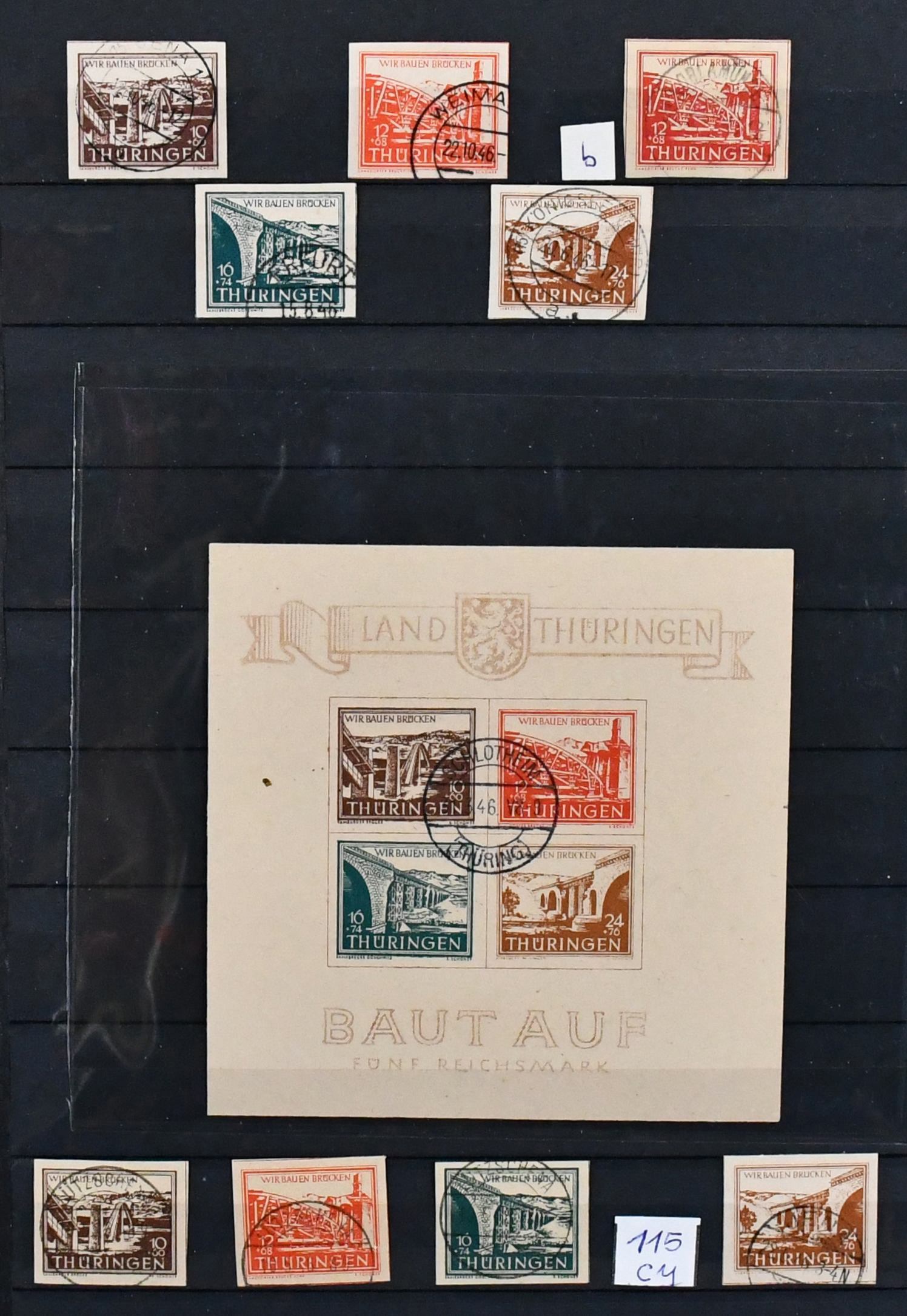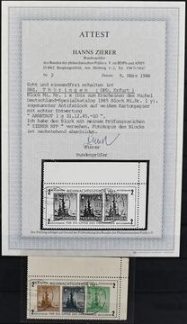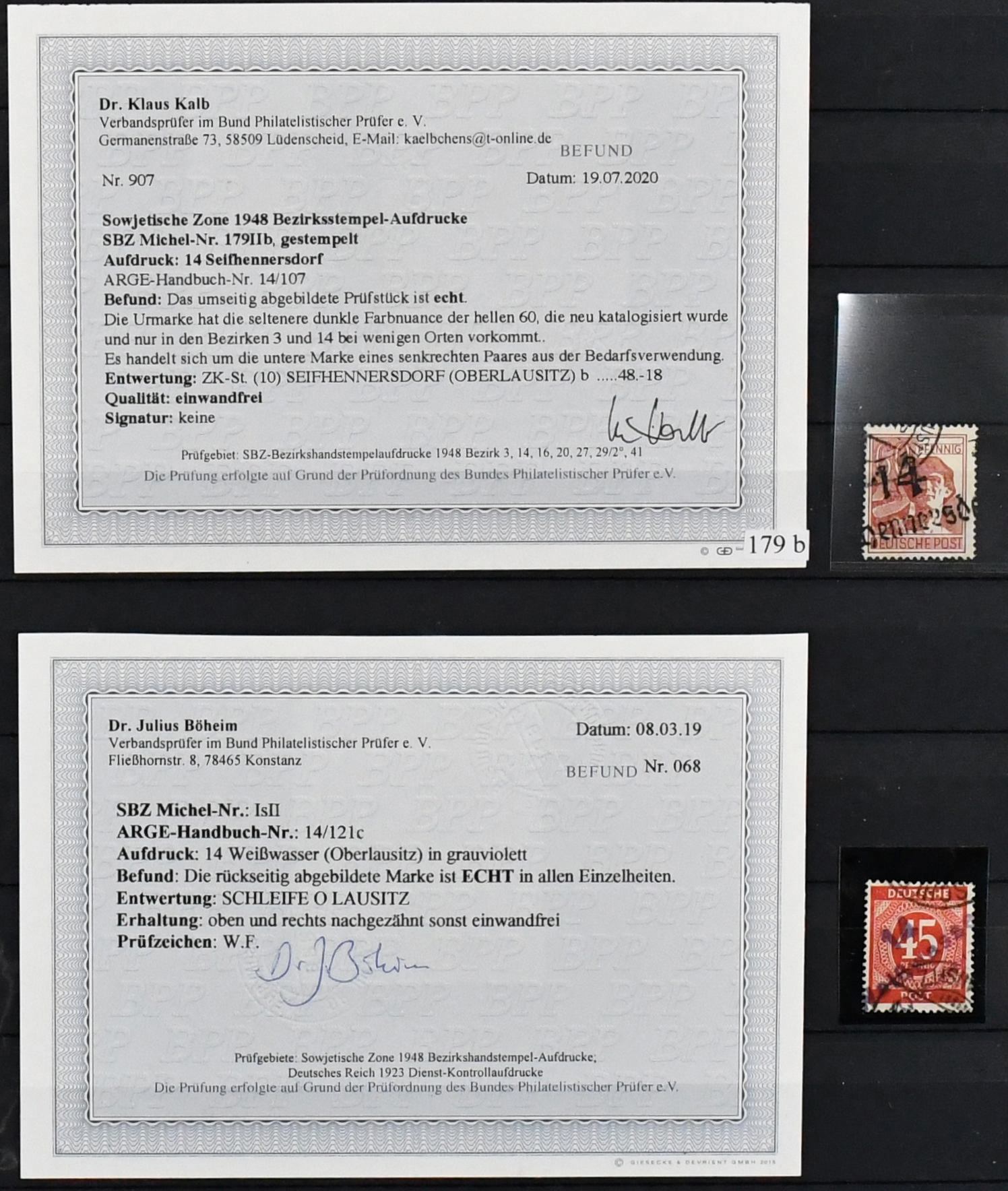 SBZ, ausschließlich gestempelte Spezialsammlung in drei Bänden, vielfach hochwertig besetzt mit allen Gebieten (es ist unmöglich, alles zu erwähnen, daher hier nur ein kleiner Auszug), u.a. Ostsachsen "Potschta", Postmeister-Ausgaben, Nr. 80X mit Attest, Thüringen Bl. 1x, 2x und t mit Attesten, Bl. 4a und c mit Attesten, Papiere mit teuren und div. Attesten, Westsachsen mit u.a. Nr. 150/55 Attest, Bl. 5X/Y, ferner starker Handstempel-Teil mit mehrfach Nr. 179 nach Bezirken, z.B. 179VIa/b mit Attesten, diverse Ziffern, Tauben mit mehrfach 5 Mark, u.a. IId, IIaVb u.v.m. (2500,-)
