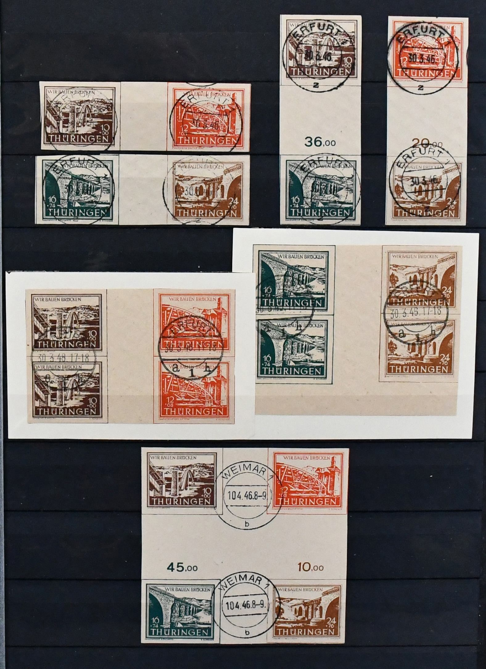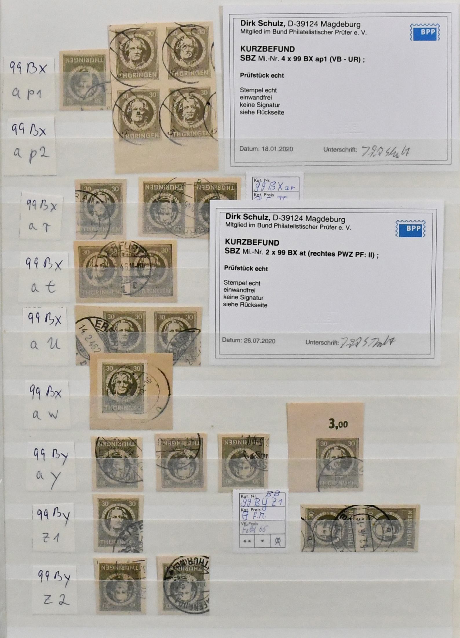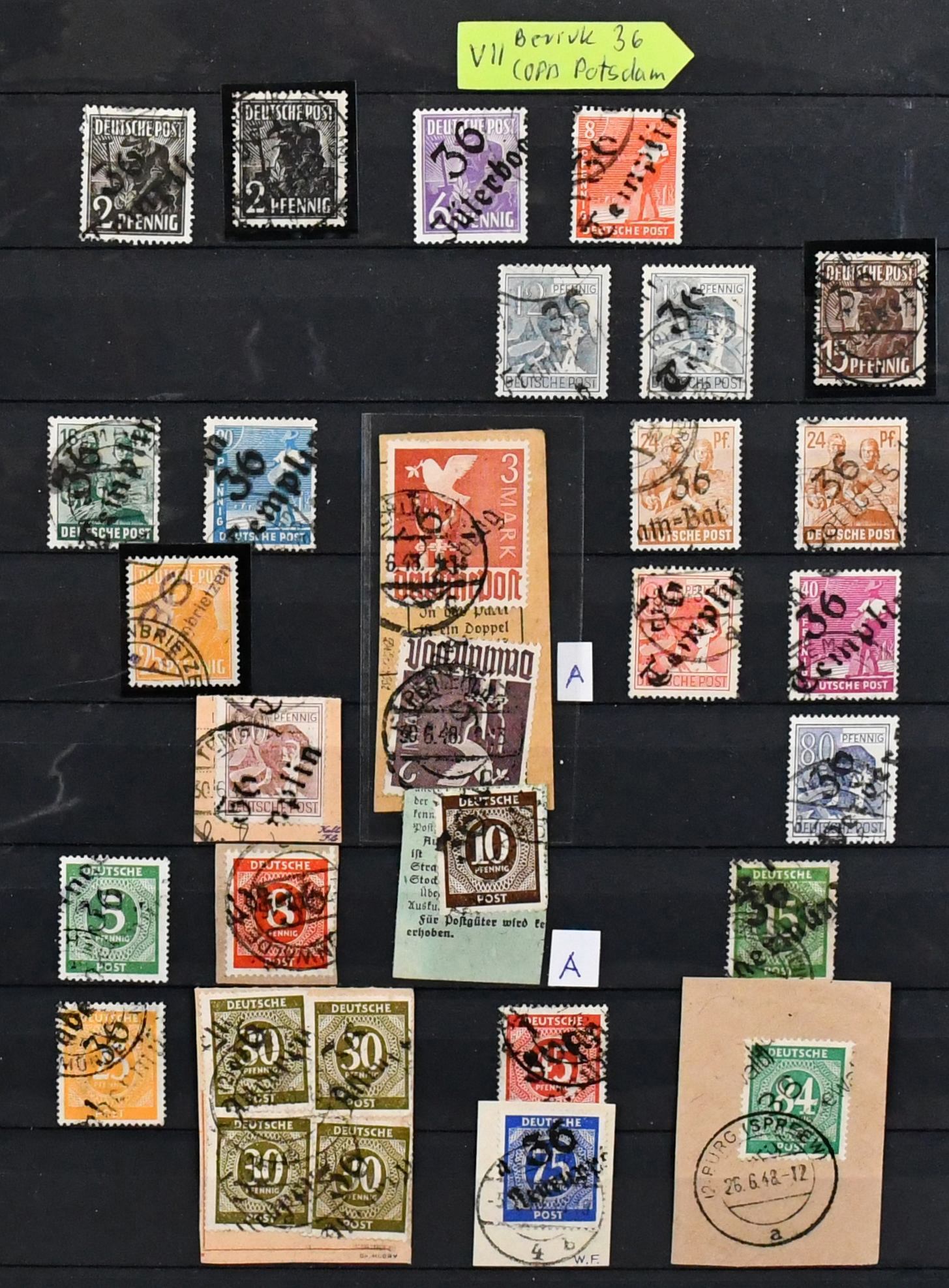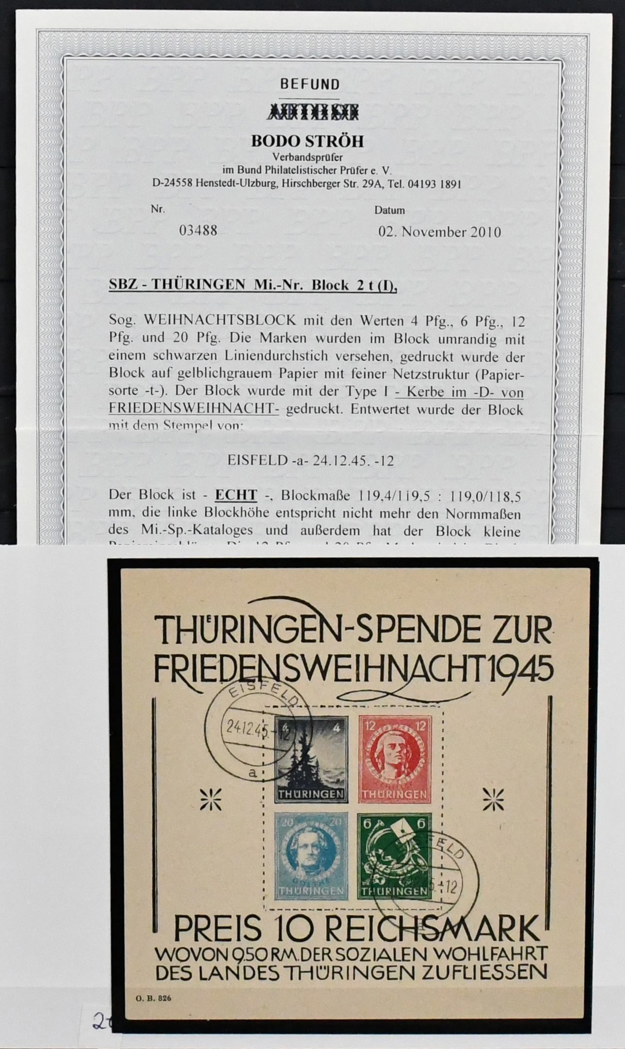 SBZ, ausschließlich gestempelte Spezialsammlung in drei Bänden, vielfach hochwertig besetzt mit allen Gebieten (es ist unmöglich, alles zu erwähnen, daher hier nur ein kleiner Auszug), u.a. Ostsachsen "Potschta", Postmeister-Ausgaben, Nr. 80X mit Attest, Thüringen Bl. 1x, 2x und t mit Attesten, Bl. 4a und c mit Attesten, Papiere mit teuren und div. Attesten, Westsachsen mit u.a. Nr. 150/55 Attest, Bl. 5X/Y, ferner starker Handstempel-Teil mit mehrfach Nr. 179 nach Bezirken, z.B. 179VIa/b mit Attesten, diverse Ziffern, Tauben mit mehrfach 5 Mark, u.a. IId, IIaVb u.v.m. (2500,-)