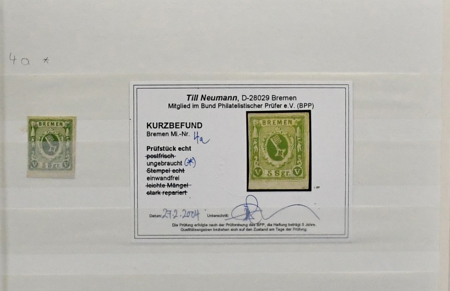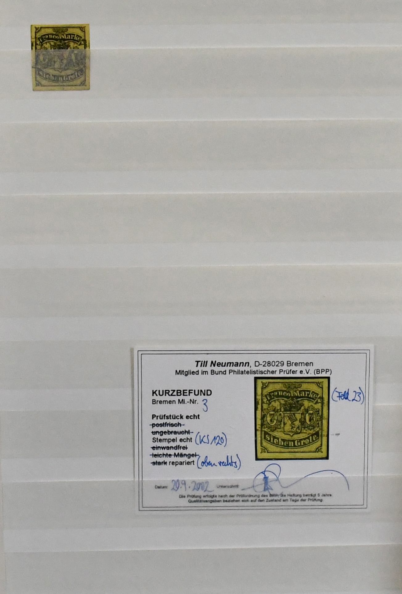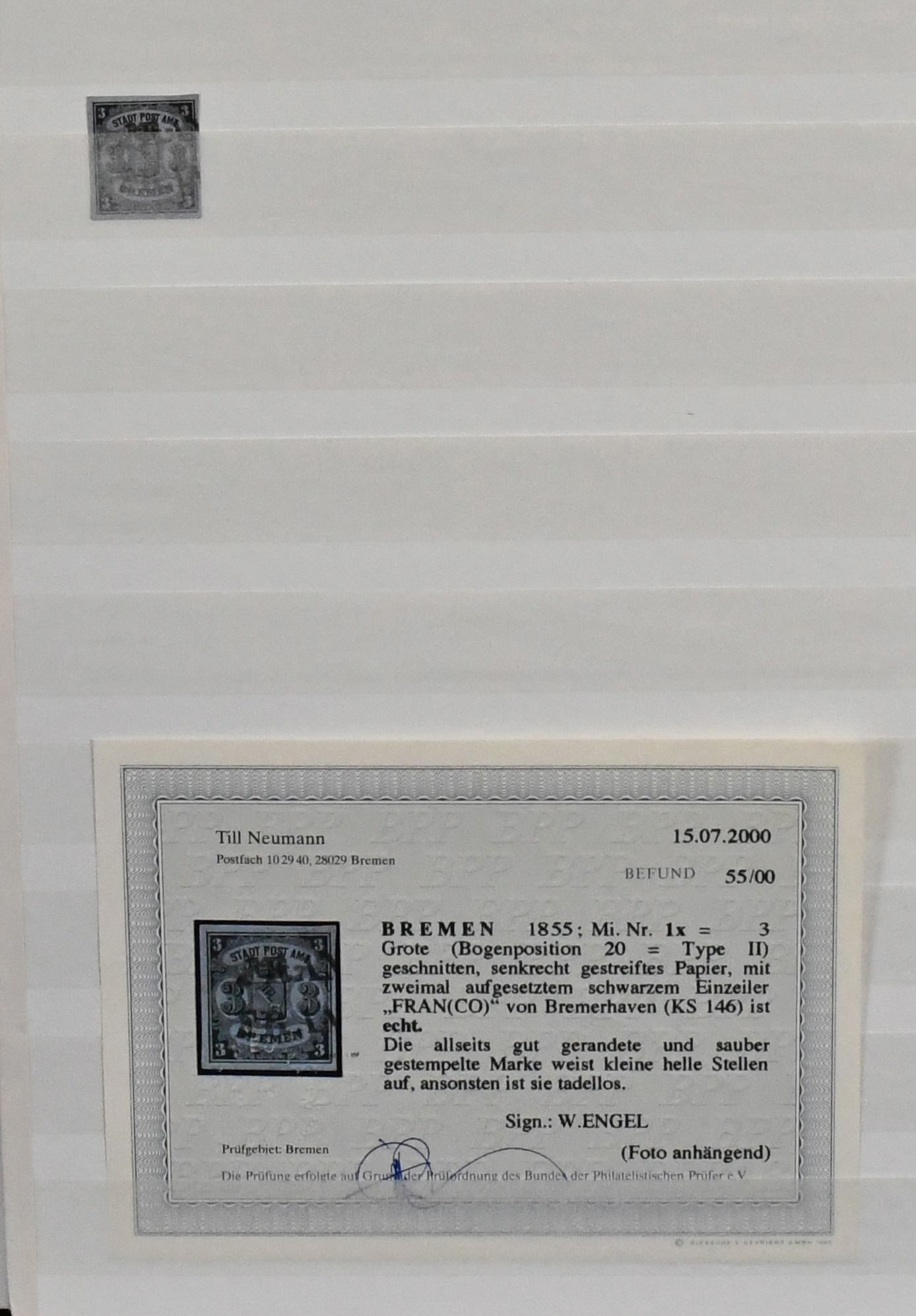 Bremen, überkomplette Sammlung, gestempelt und ungebraucht, in üblich unterschiedlicher Erhaltung, diverses gepr./Attest, ab Nr. 1x/y, auch die folgenden oft nach Unternummern, z.B. mit Briefstück Nr. 5c (Attest Neumann), 6y gest. (rep., Attest Neumann), 8A/B je gest. (je Befund Neumann), 10b ungebr. und gest. (rep.), 13 gest. (rep., Attest Neumann), 15a ungebr. etc. Der von uns verläßlich ausgerechnete Michelwert liegt bei über 35.000,- Euro (1800,-)