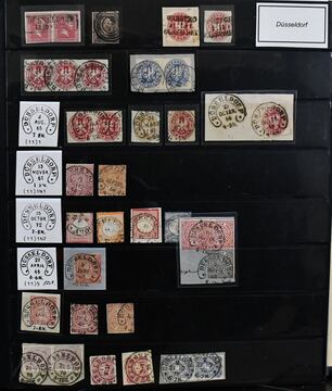 "Düsseldorf und seine Stadtteile", Heimatslg. mit 170 Marken (oft auf Briefstück) und 108 Belegen, von Vorphila bis Deutsches Reich (die späteren nicht mitgezählt). Dabei 16 Belege mit Hufeisenstempeln, Brief Preußen Dreierstreifen Nr. 6 mit NS "359", Sondertypen-Stempel, sowie lose Nr. 6 mit seltenem NS "522" (Haan)