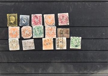 Preußen, Steckkarte mit teilweise sehr seltenen Abstempelungen, allerdings meist in II. Wahl. Dabei seltener NS "863" (Lipporg, Feuser + 400,-) auf Nr. 3, Nr. 11 mit dänischem NS "1", Nr. 15 mit seltenem blauem Grotesk-K1 "Hildesheim", Nr. 24 mit Taxis-NS "377" sowie weitere 3 Kr. mit neuem Grotesk-K1 "Allendorf a.d. Lumda"