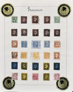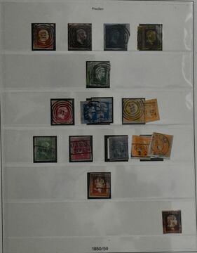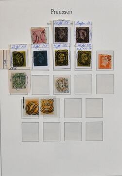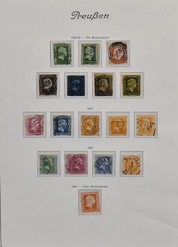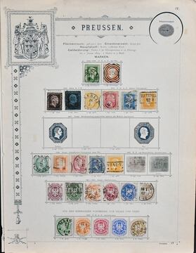 Preußen, meist gest. Slg. in etwas untersch. Erhaltung auf alten Goldschnitt-Vordrucken, dabei u.a. Nr. 1-3, 5, 6-8, 9-12, 14-15, 22-26 usw., ferner etliche Ganzsachen-Abschnitte, einiges haftend, aber im Wasserbad sicher ablösbar
