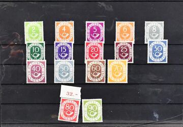 Bund, Zusammenstellung besserer Erstausgaben in etwas untersch. Erhaltung inkl. postfrischem Posthorn-Satz, teils sign. Schlegel (Mi. 2200,-), zwei postfr. Viererblock-Serien Nr. 153-54 (360,-), 177-96 postfr. (300,-), ferner Nr. 184x gest. OR-VB (100,-), 259 gest. VB (300,-), sowie Nr. 260 im waager. Paar (200,-)