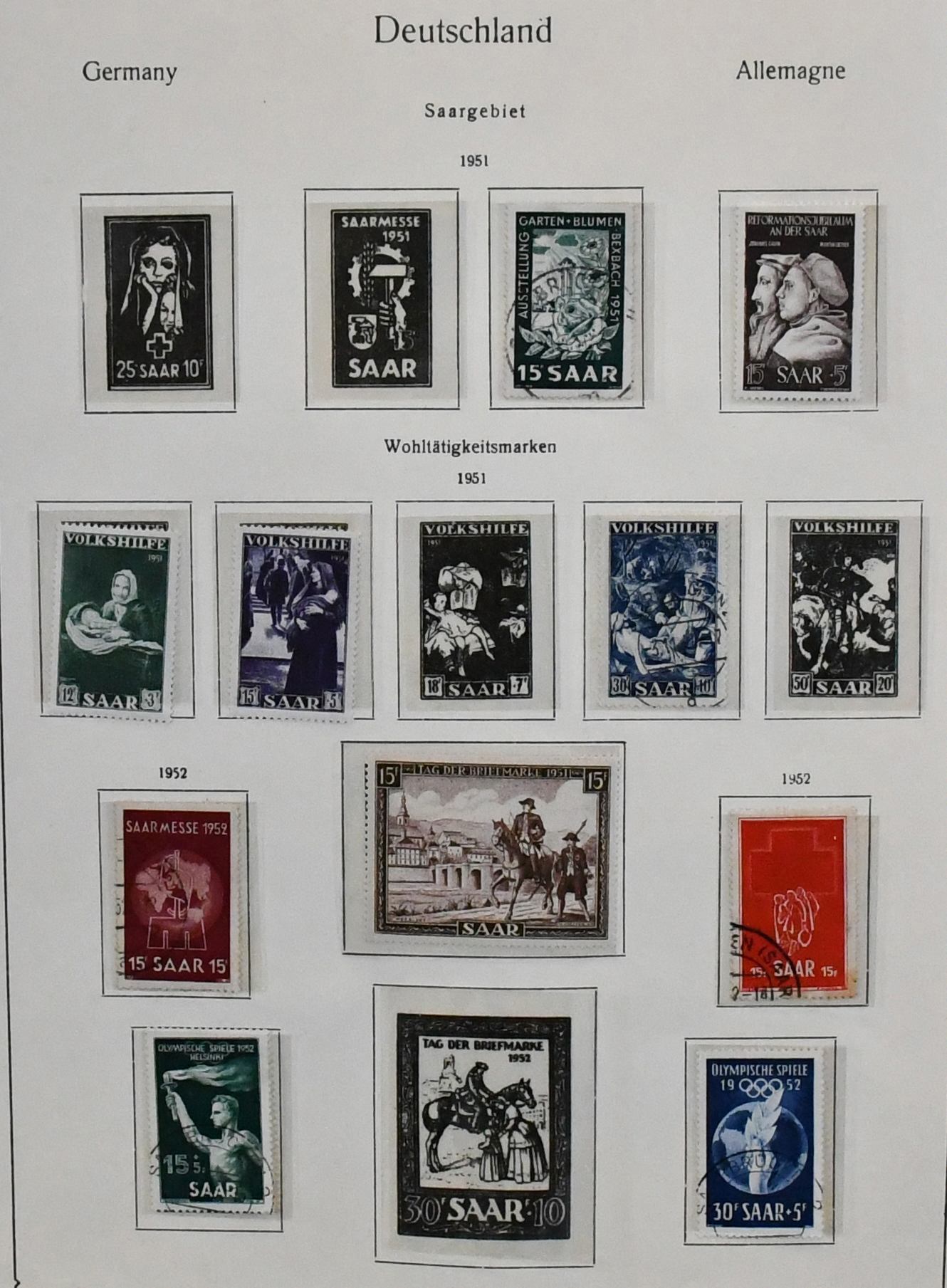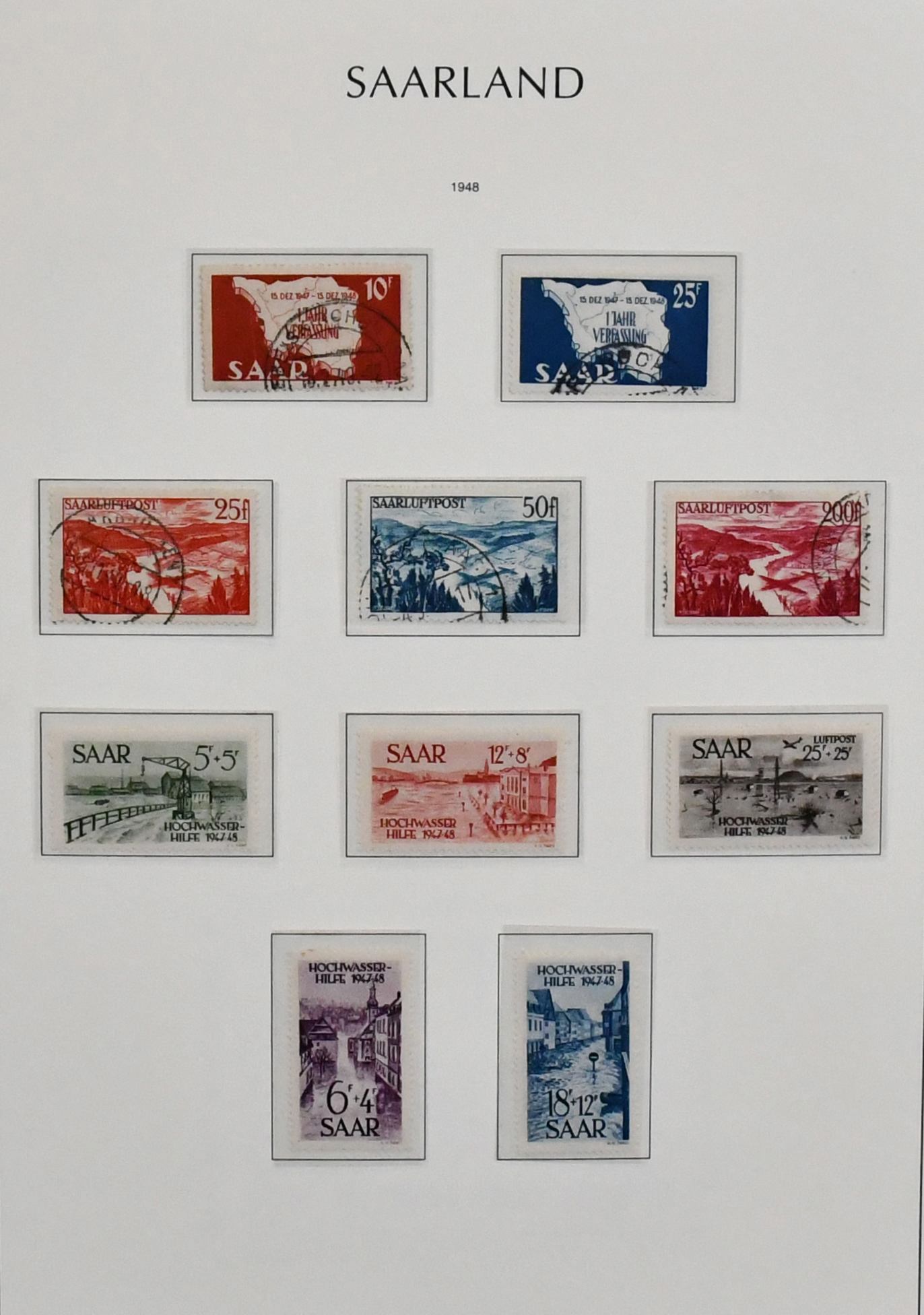 Saar, 1947/1959, bis auf Bl. 1/2 und Nr. 298 komplette Sammlung, teils postfrisch, teils gestempelt, im Sieger-Vordruckalbum. Dabei alle Volkshilfe-Sätze postfr., Hochwasserhilfe-Satz, Nr. 291/92 postfr., beide Heuss-Sätze, Dienst Nr. 33/44, je postfr., usw. Mi. 1600,-