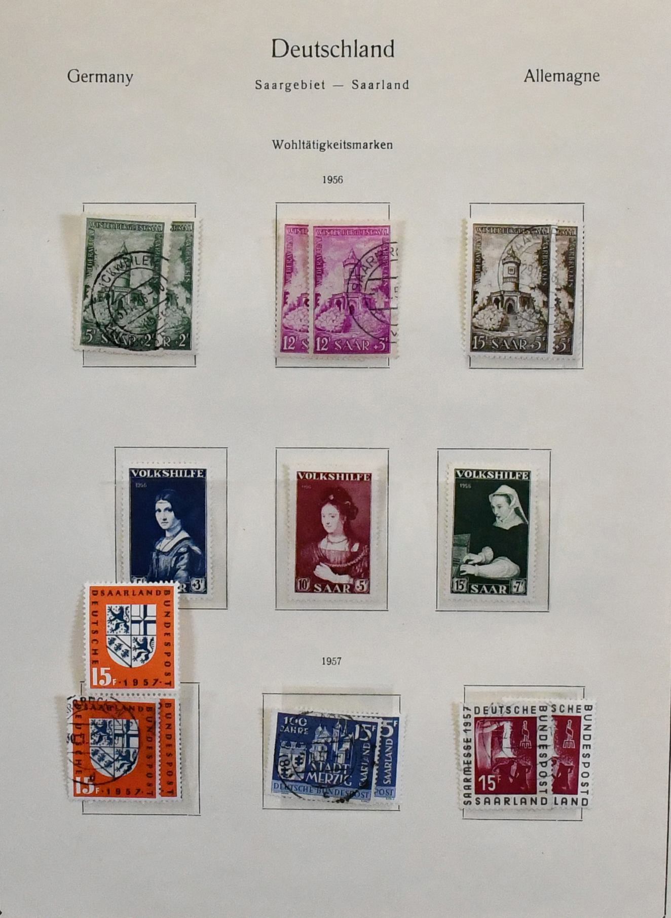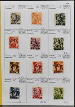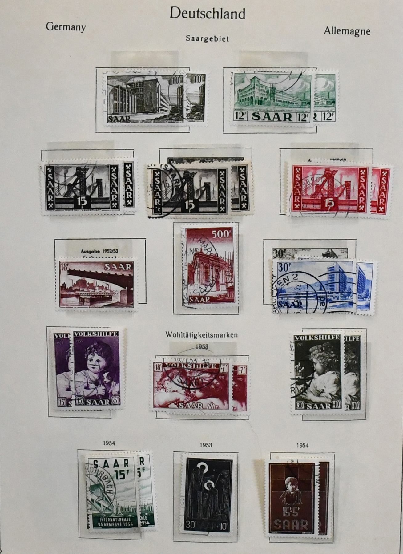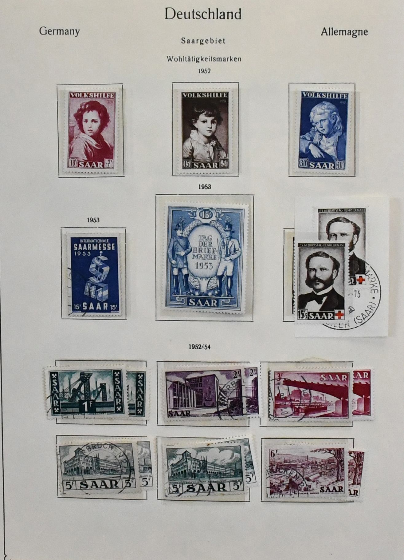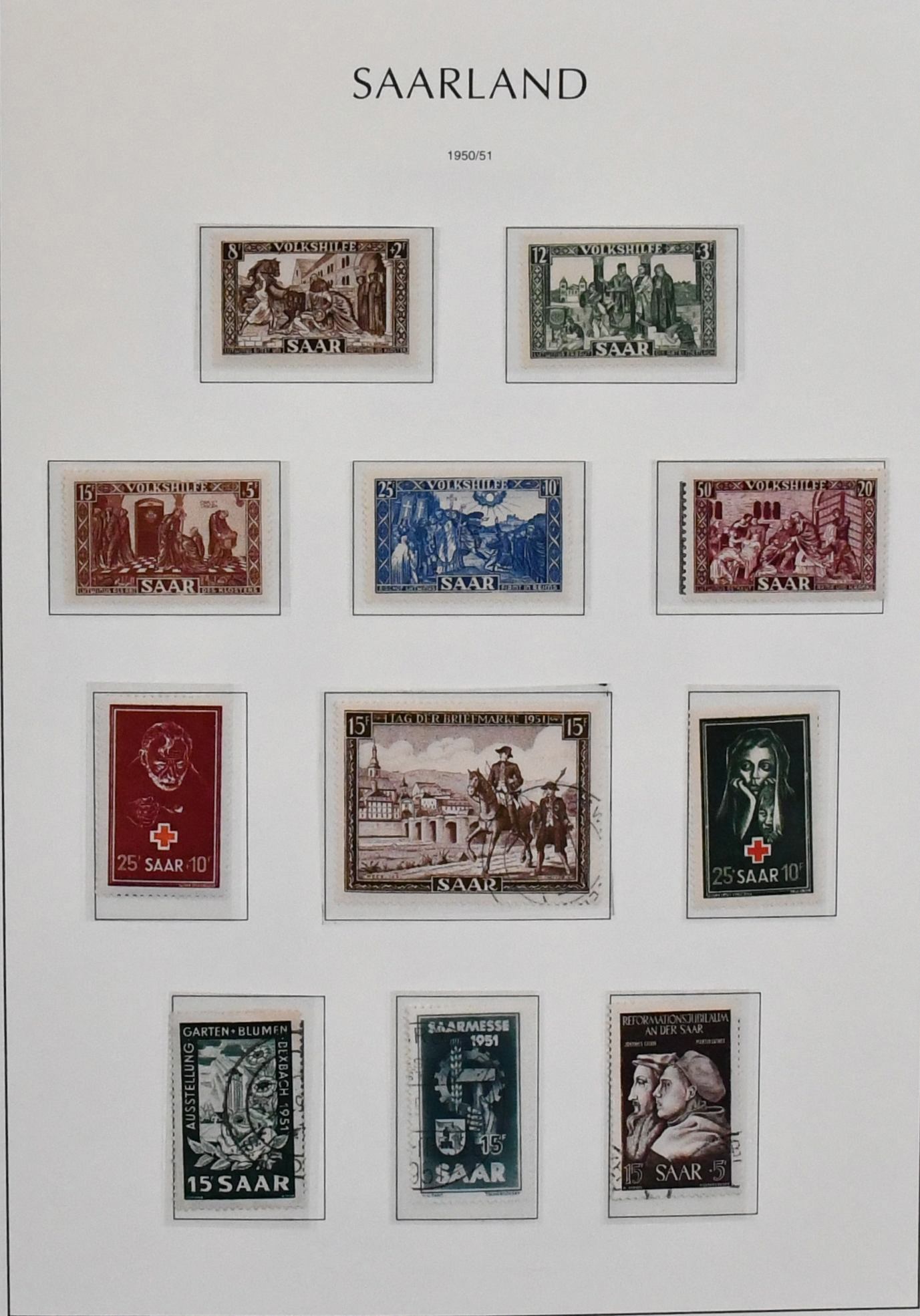 Saar, 1947-1959, teils ungebrauchte, schwerpunktmäßig aber gestempelte Sammlung auf alten Vordrucken, dabei u.a. Nr. 226/38, 255/59, 262/63, je gest., 200 Fr. Europarat gebr. und ungebr., bessere Volkshilfe-Werte, beide Heuss-Sätze, Dienst Nr. 33/44 ungebr. usw. Mi. knapp 2000,-