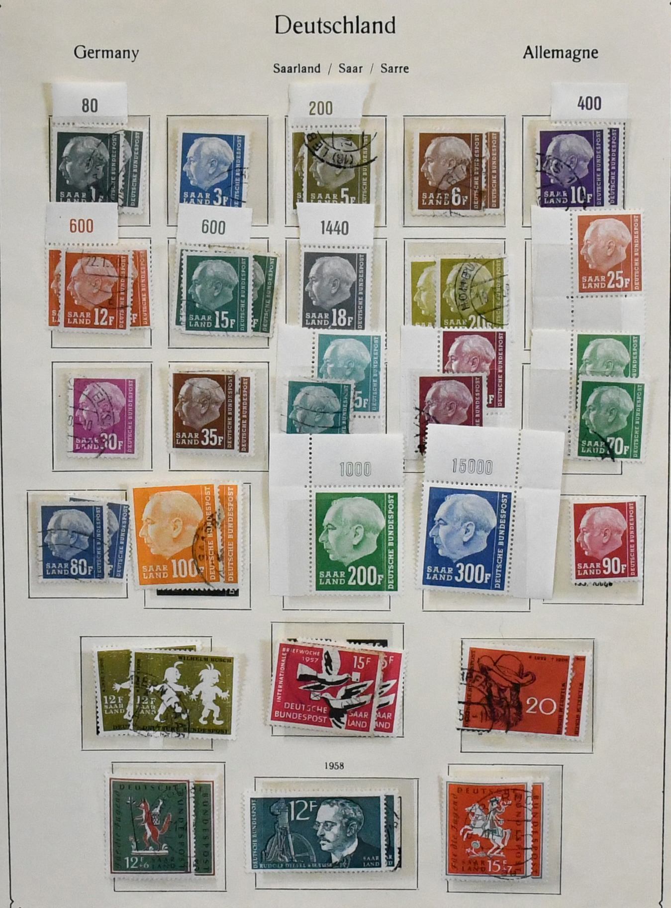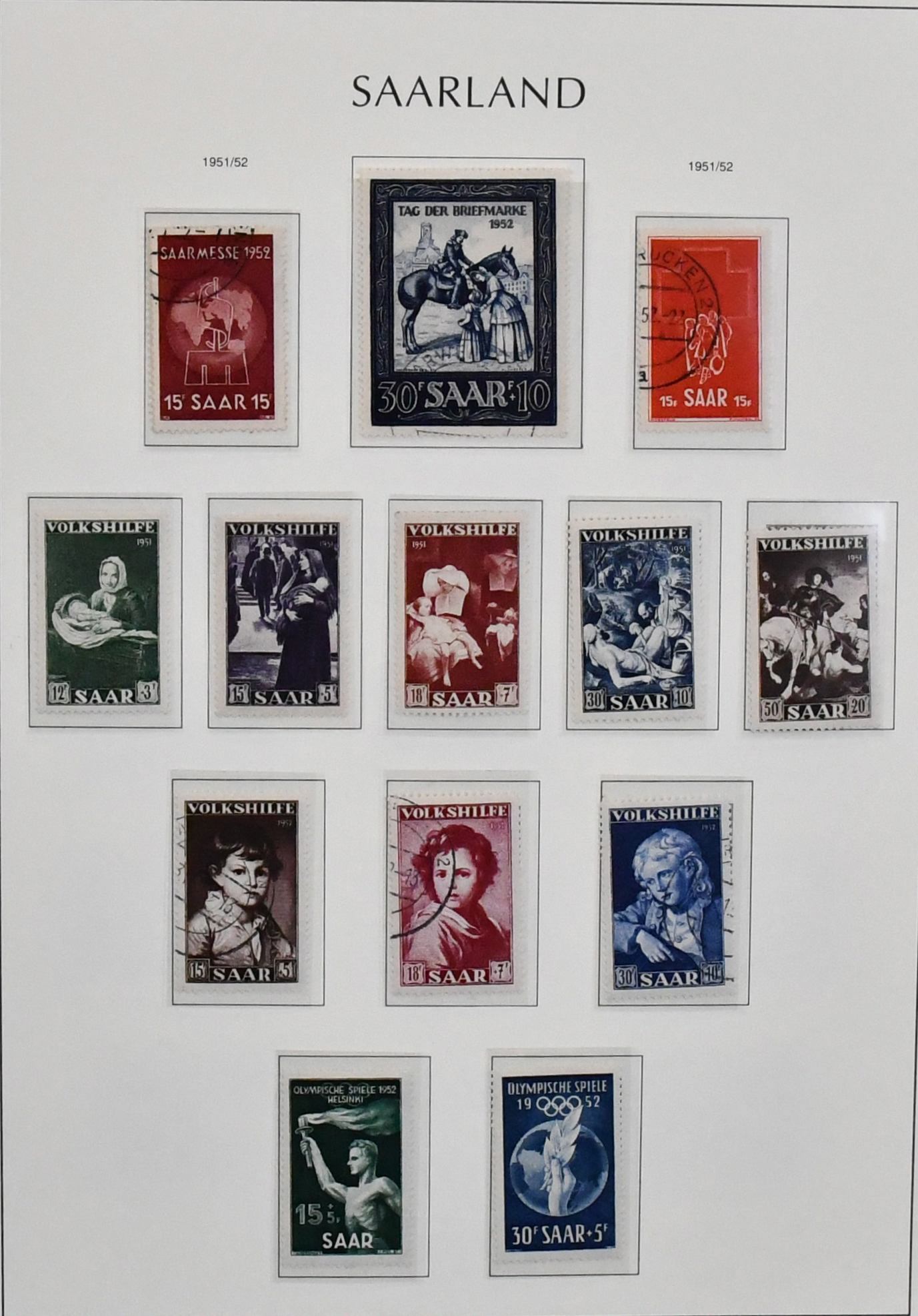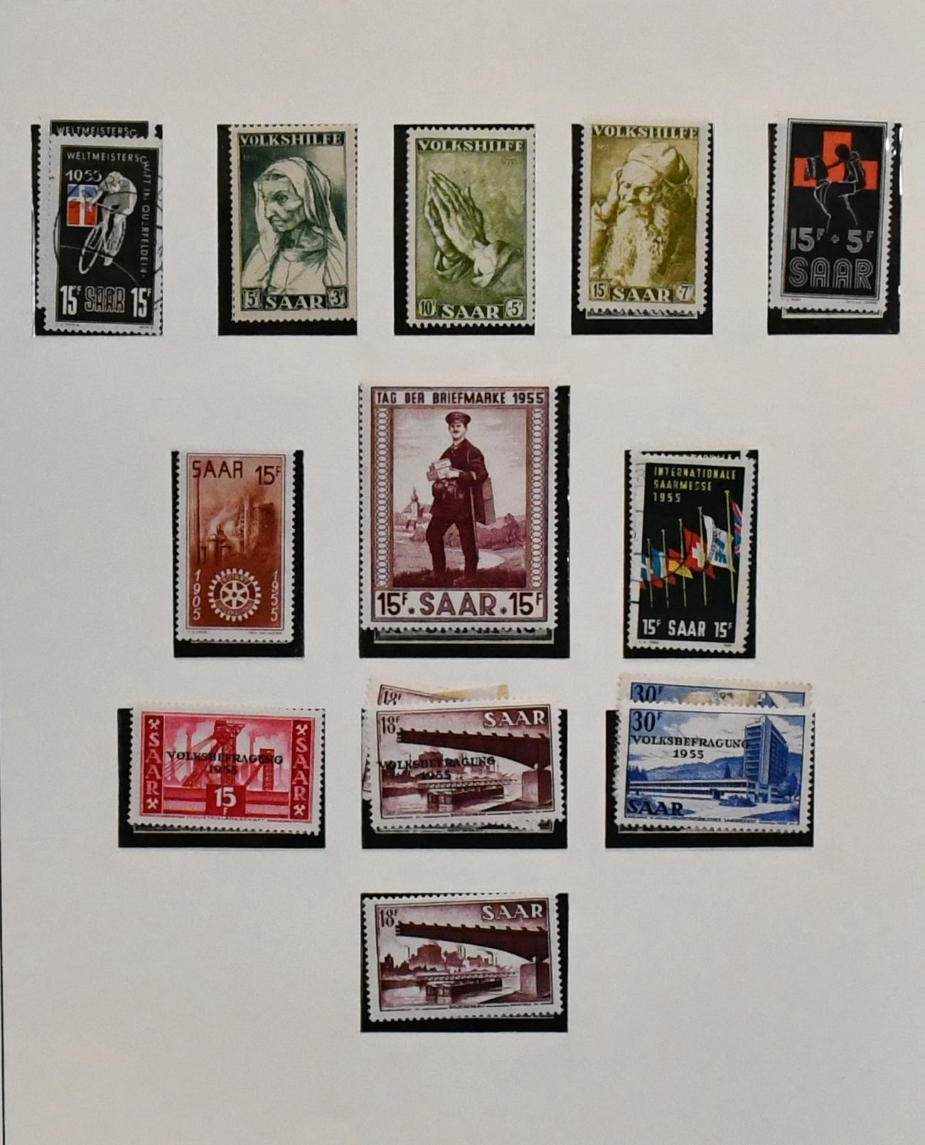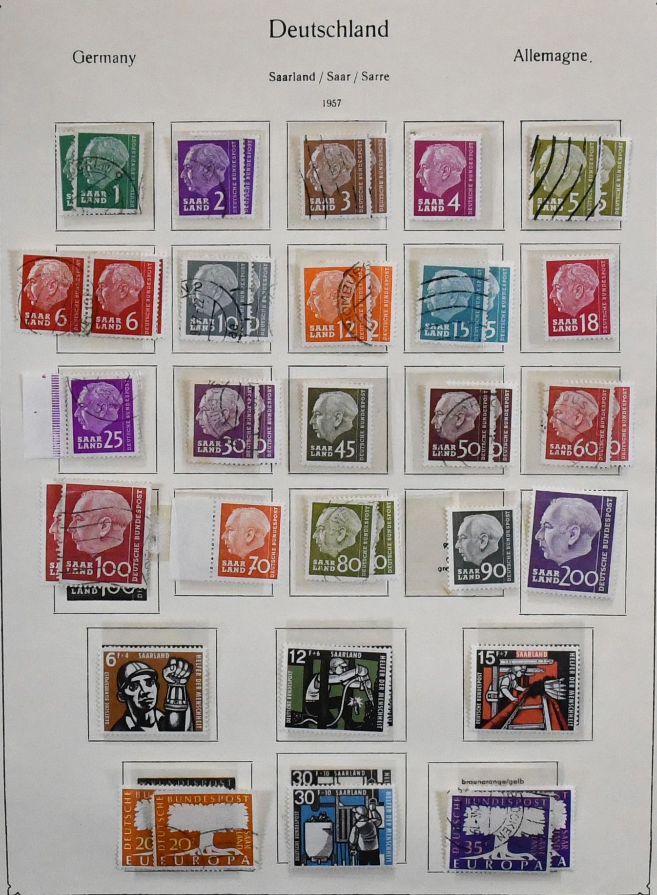 Saar, 1947-1959, teils ungebrauchte, schwerpunktmäßig aber gestempelte Sammlung auf alten Vordrucken, dabei u.a. Nr. 226/38, 255/59, 262/63, je gest., 200 Fr. Europarat gebr. und ungebr., bessere Volkshilfe-Werte, beide Heuss-Sätze, Dienst Nr. 33/44 ungebr. usw. Mi. knapp 2000,-