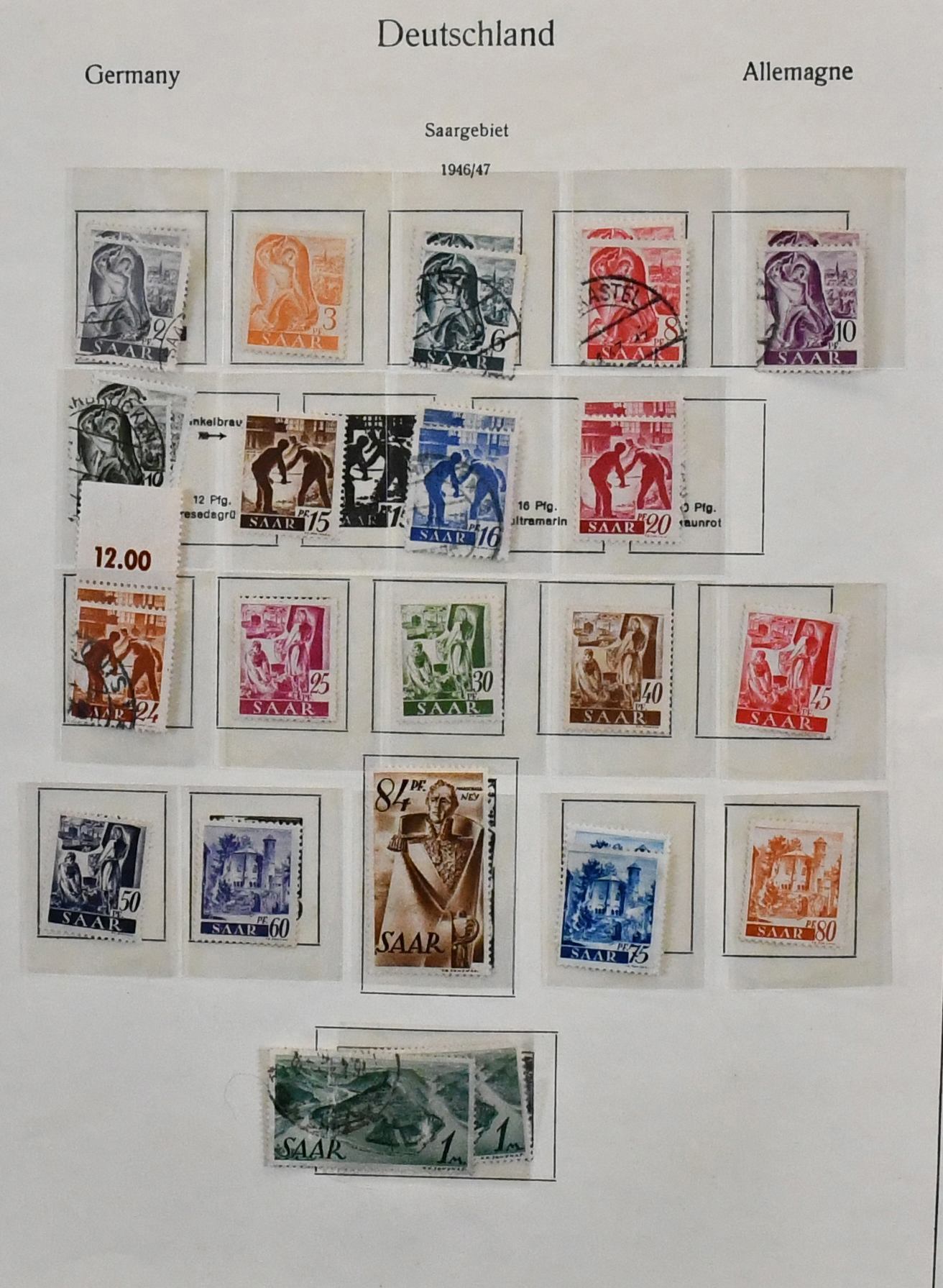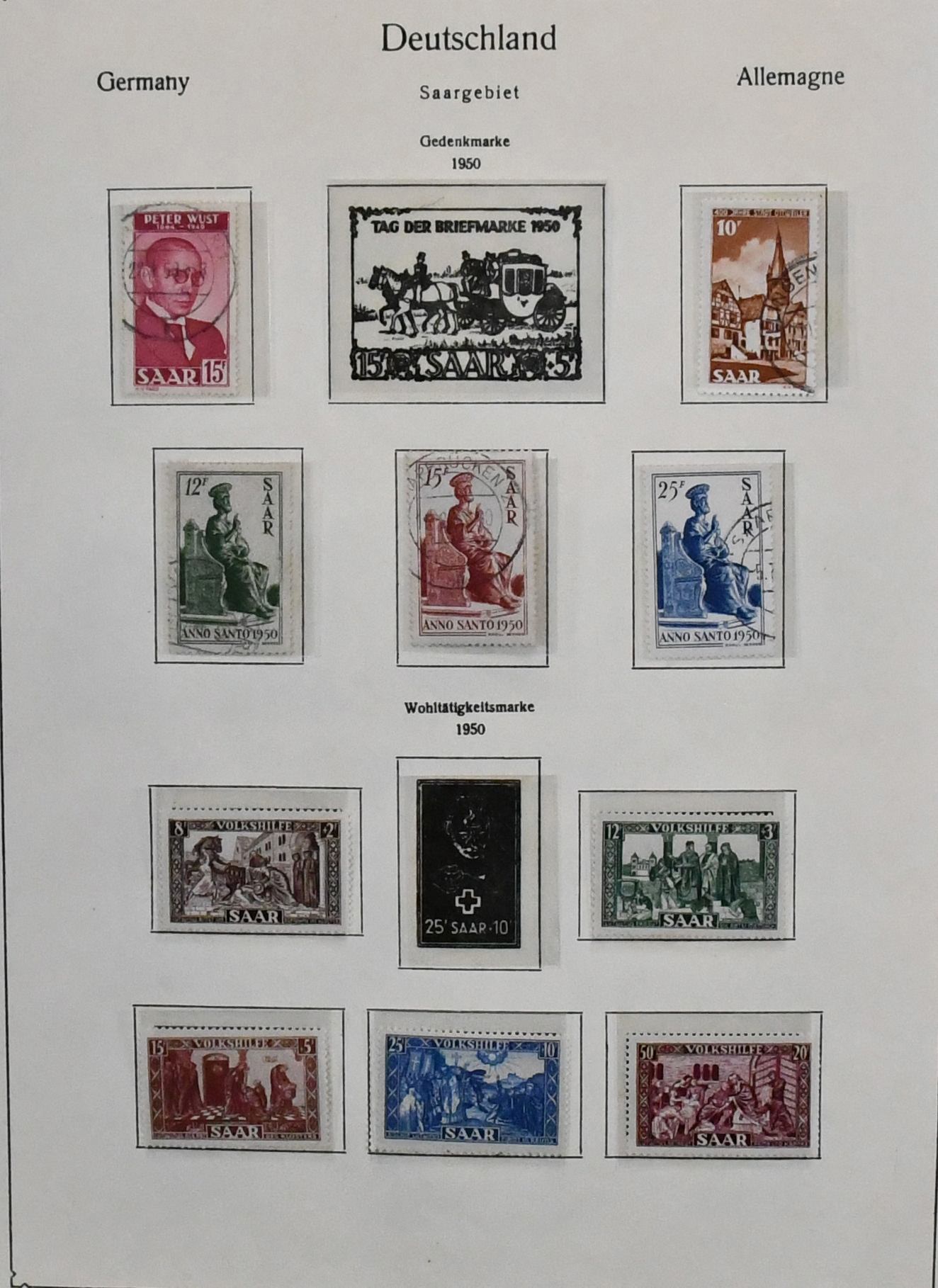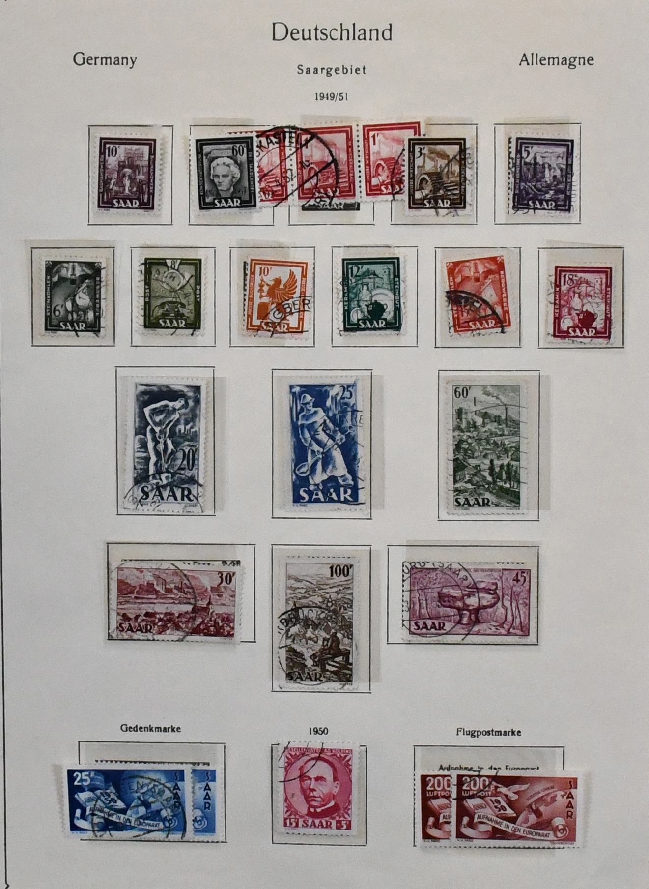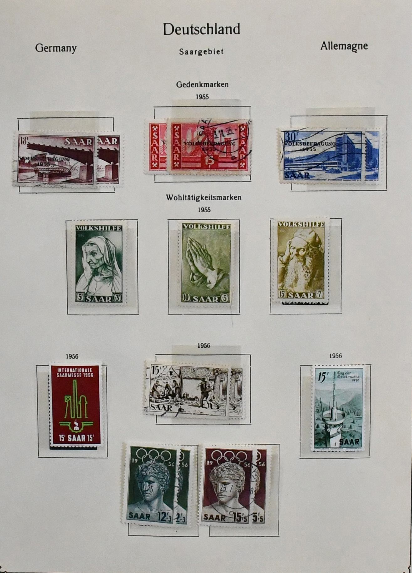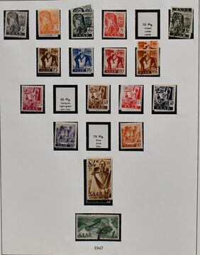 Saar, 1947-1959, teils ungebrauchte, schwerpunktmäßig aber gestempelte Sammlung auf alten Vordrucken, dabei u.a. Nr. 226/38, 255/59, 262/63, je gest., 200 Fr. Europarat gebr. und ungebr., bessere Volkshilfe-Werte, beide Heuss-Sätze, Dienst Nr. 33/44 ungebr. usw. Mi. knapp 2000,-