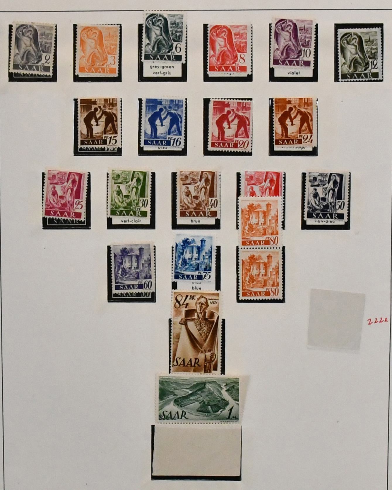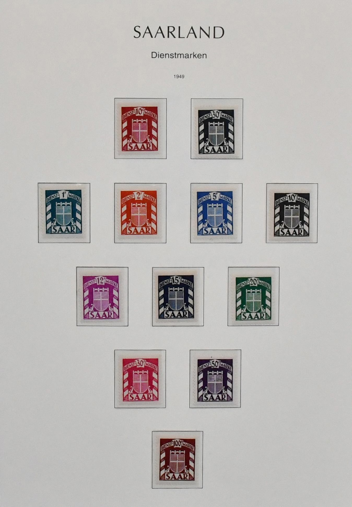 Saarland, 1947-1959, postfrische, nahezu kpl. Slg. im Lindner-T-Vordruckalbum, dabei u.a. Extras der Dauerserien mit einigen Urdrucken, Aufdruck-Besonderheiten, Sondermarken, u.a. Nr. 255/59, Volkshilfen Nr. 267/71, 299/303, 309/13, Freimarken Nr. 272/88, Ibasa Nr. 291, Rotkreuz, Nr. 297/98, OPD mit beiden Heuss etc.
