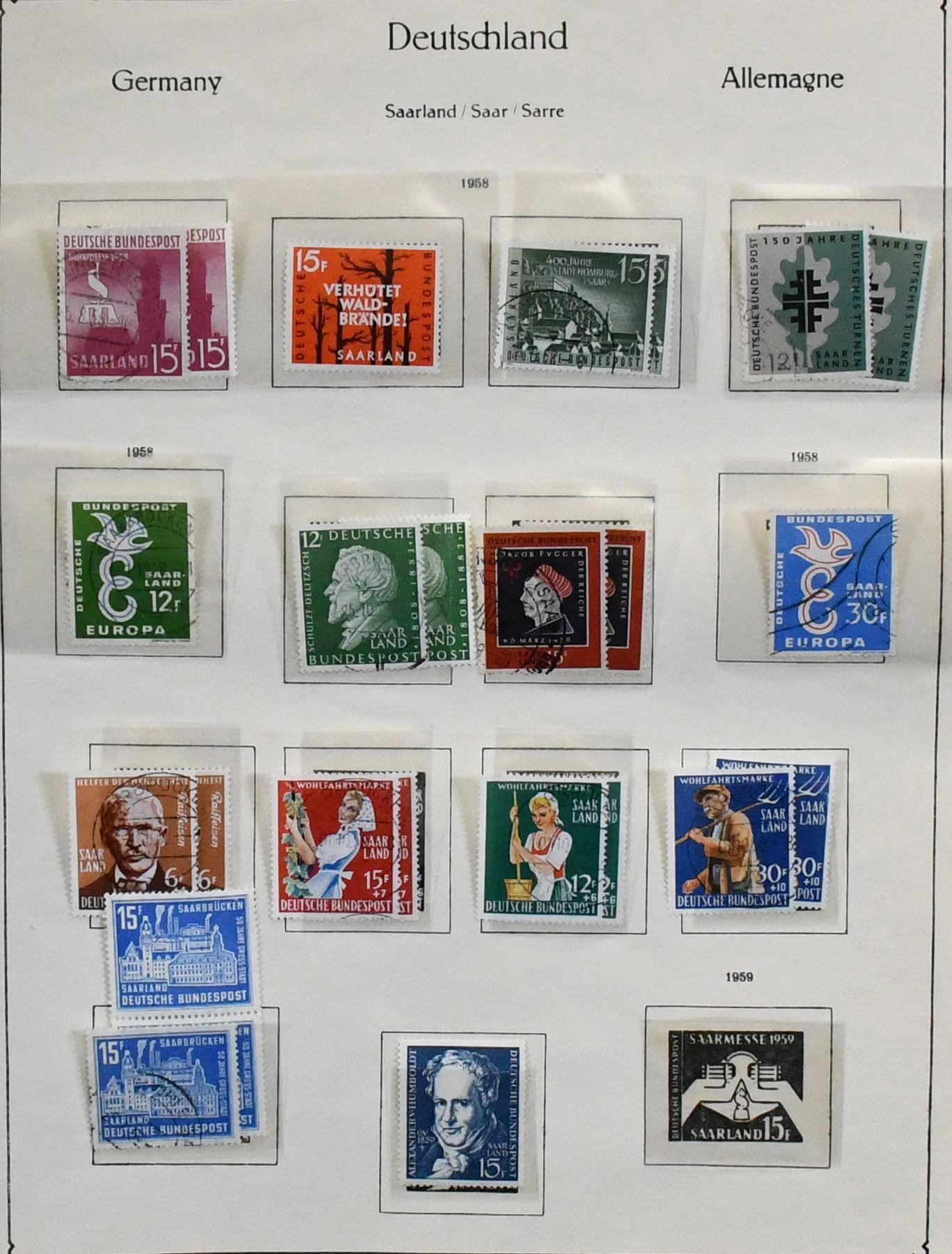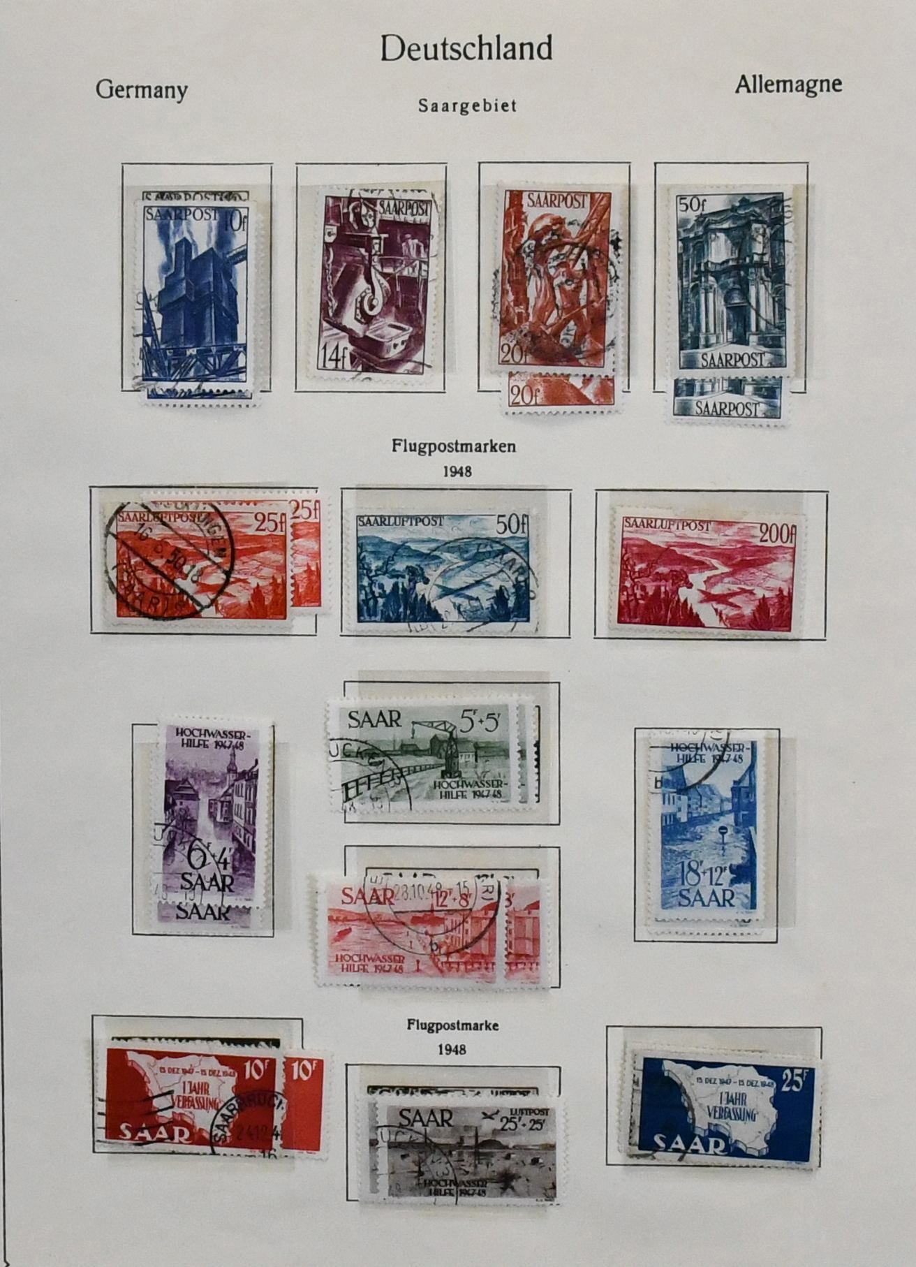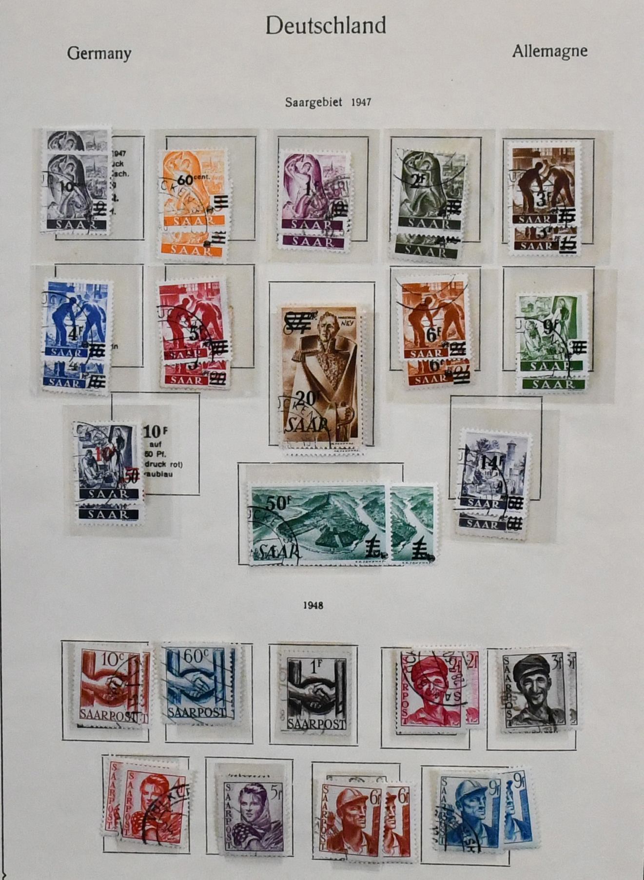 Saar, 1947/1959, nur ohne Blockpaar und Urdruck, kpl. gestempelte Slg. mit allen besseren Ausgaben, u.a. Nr. 289/95, Europarat, allen Volkshilfe- und Heuss-Sätzen, Hochwasserhilfe-Satz, Dienst Nr. 33/44 usw., auf Vordrucken. Mi. 4400,-
