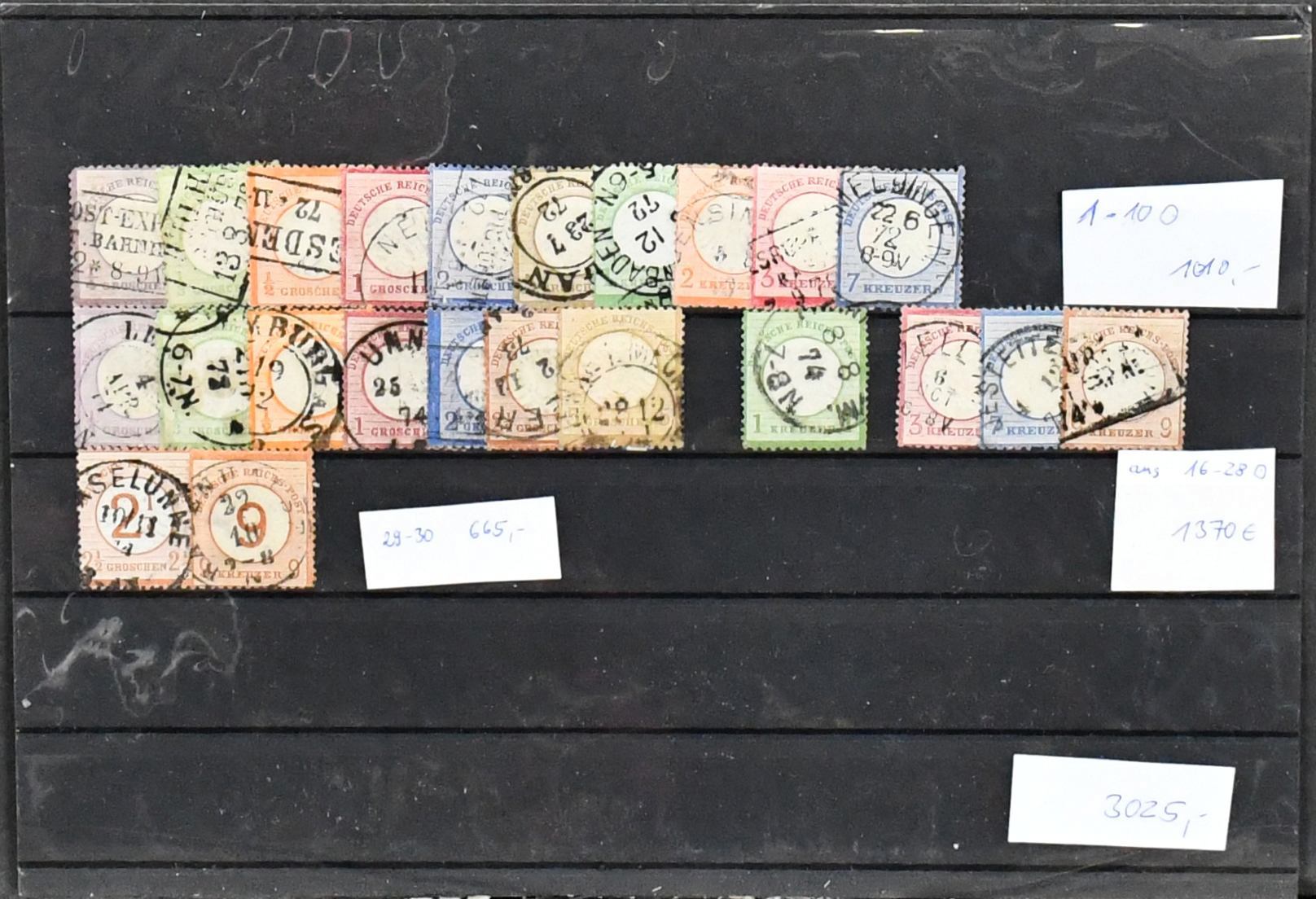 Brustschilde, überkomplette gestempelte Slg. auf Bl., mit allen Spitzen (Nr. 12/13 einmal handschriftlich entwertet und zusätzlich Nr. 13 gest., gepr. Bühler), Nr. 24 u. 28, 27b, zweimal Nr. 29 etc., auch Besonderheiten wie Nr. 27 mit Letzttags-K2 "Posen 31.12.74" (Groschen-Gebiet) etc. Auffällig ist, dass der Sammler durchweg Wert auf klare, zentrische Abschläge gelegt hat, deshalb ist der von uns errechnete Michel-Wert von rund 16.000,- trotz der üblich etwas untersch. Erhaltung nur ein Ansatzpunkt (auch viele Luxusstücke enthalten!). Unberechnet dazu eine unseres Erachtens falsch gest. weitere Nr. 30, sowie fünf versch. Telegraphenmarken