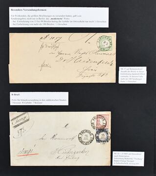 Brustschilde, Slg. von nur Besonderheiten auf Blanko-Blättern, beginnend mit NDP-Brief vom 12.5.71, dem ersten Tag der Reichspost nach Umbennung der NDP-Post, vieles gepr. bzw. Befund, dabei Nr. 10 in MiF mit Nr. 25 auf Recobrief, Nr. U1A früh im Januar 1872 gebraucht als Ortsbrief Berlin, Nr. 17a als EF auf seltenem Ortsbrief aus Berlin, Nr. 25SKA auf Brief (Befund), etliche Plattenfehler, u.a. Nr. 19XVIII, sowie 25XI und XXXV je auf Brief (Befund), zwei extreme doppeldruck-ähnliche Schmitzdrucke, Formate L14 bis L16, fZL, Doppelprägung Nr. 28 (drei Atteste), Hufeisenstempel, Nr. 15 mit sehr rauher Zähnug auf Postkarte, diverse Werte mit Doppelentwertungen inkl. Transitstempeln, zwei Briefe vom 1.1.75, ein Brief vom 4.8.78 unbeanstandet etc. Reizvolles Los